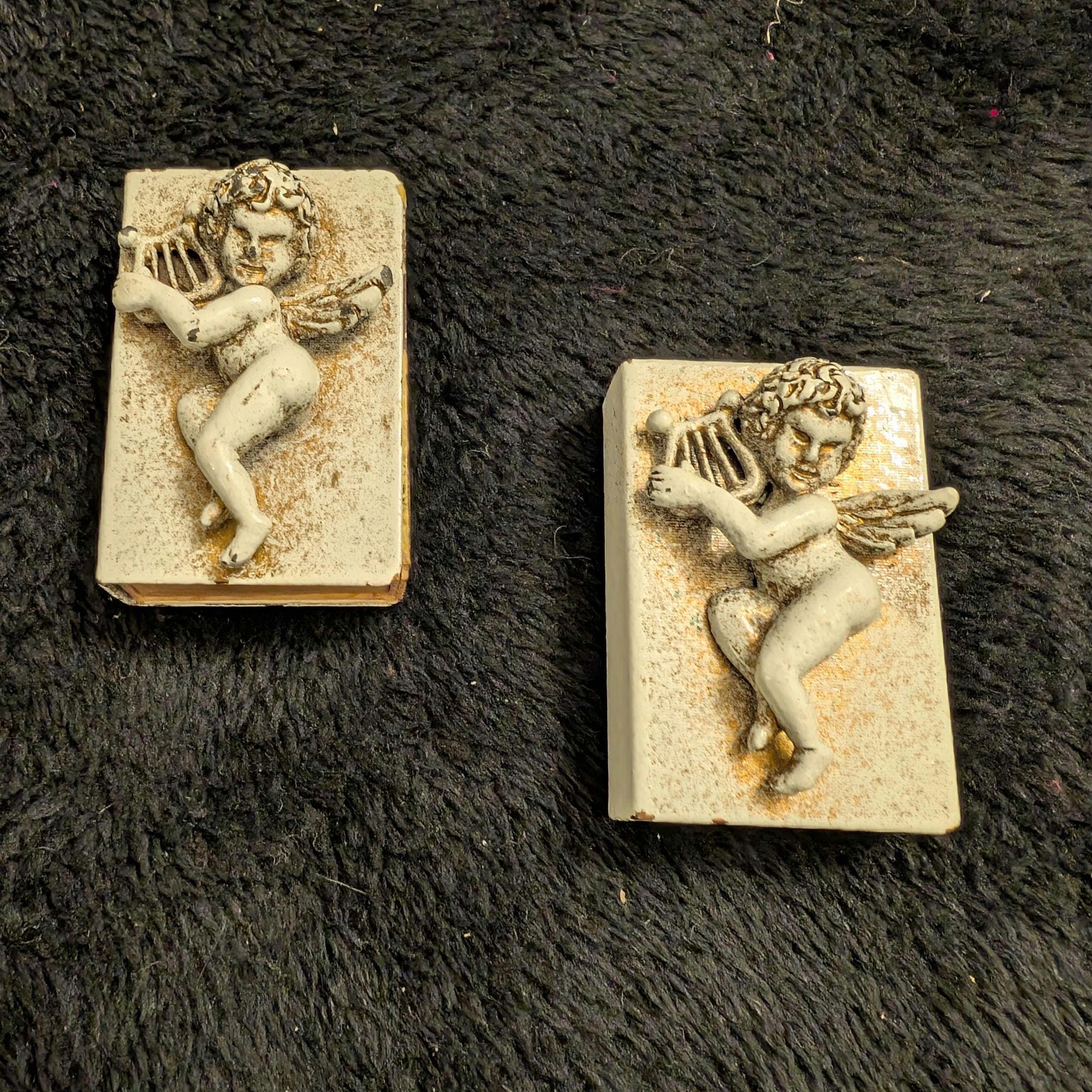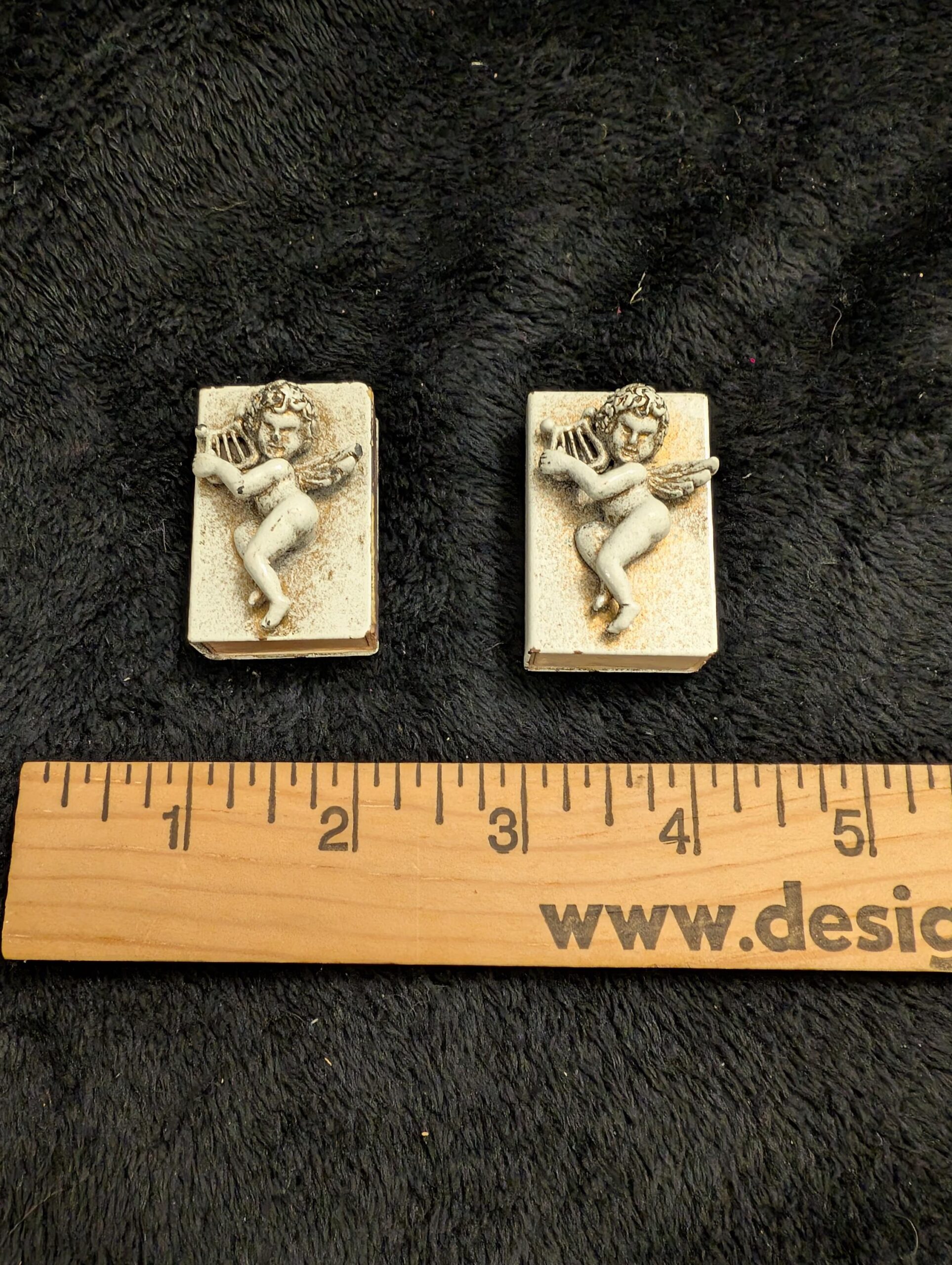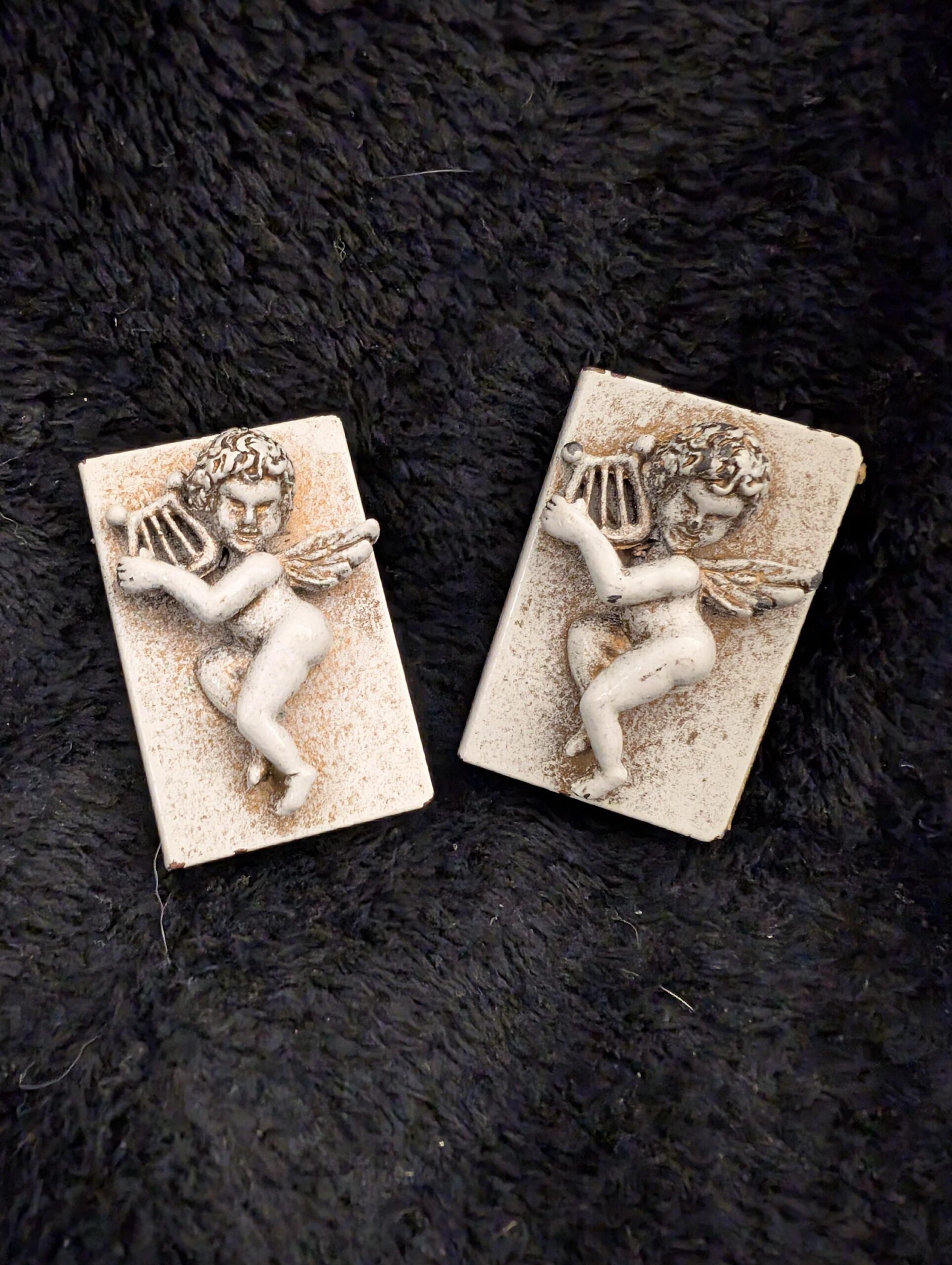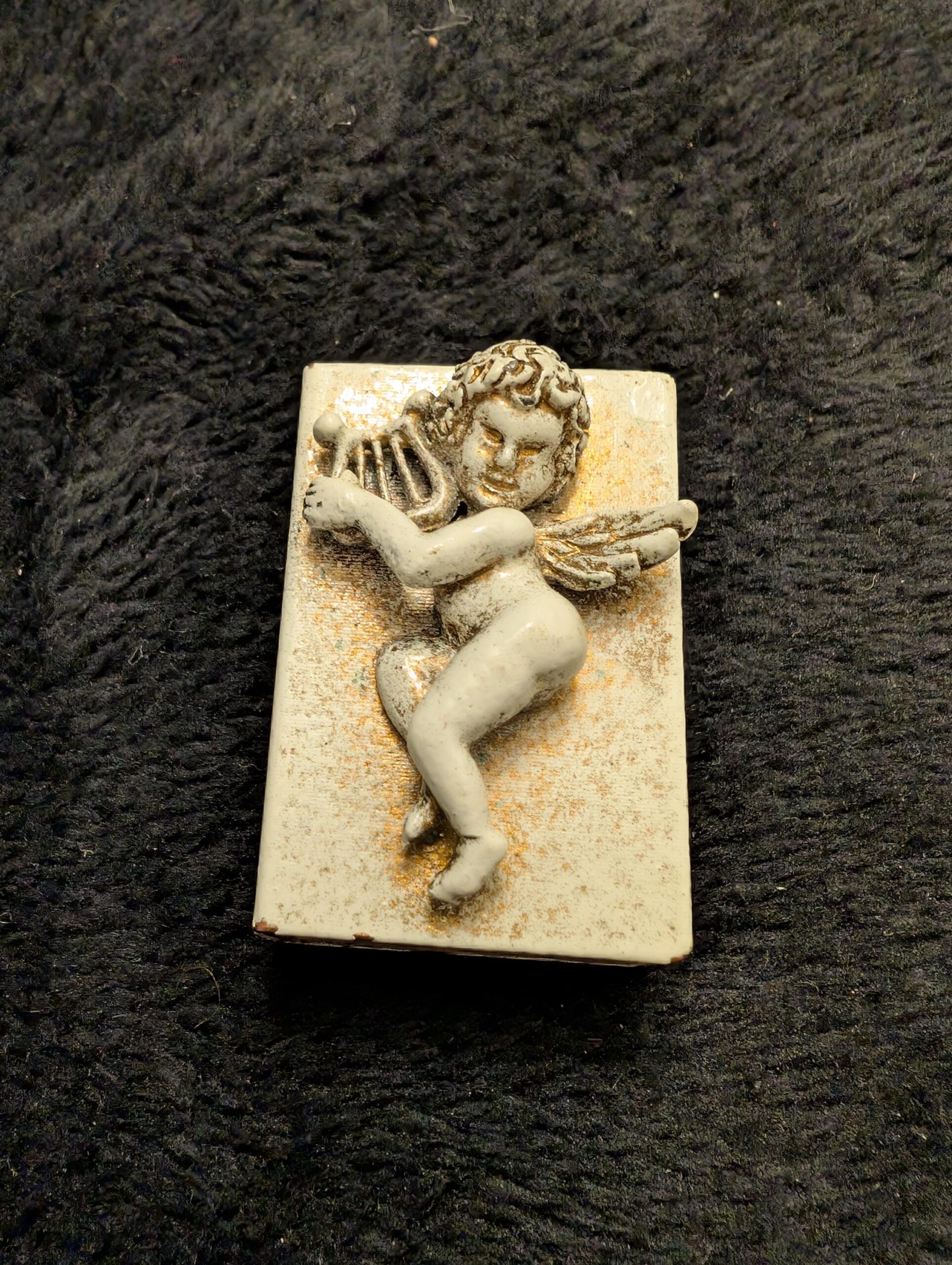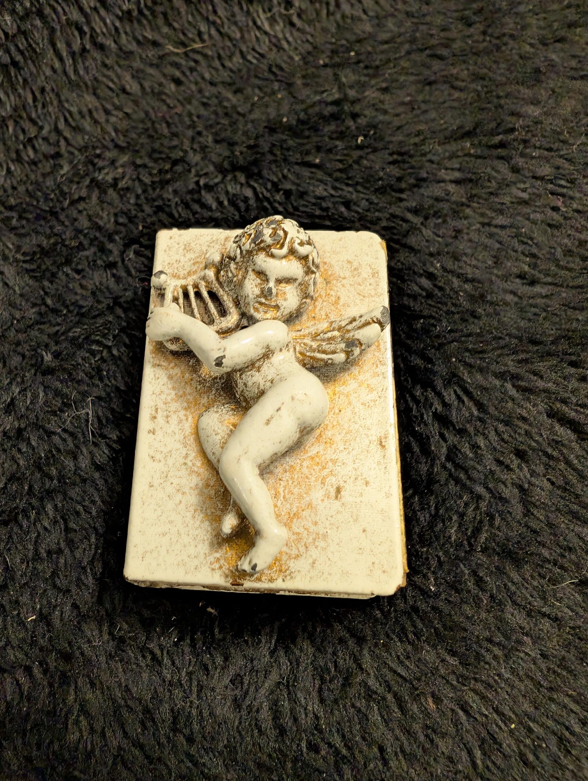 This vintage matchbox features a unique 3D enamel cherub design playing a harp. The matchbox’s antique white finish and the cherub's delicate details create a nostalgic, retro look that's perfect for collectors or those seeking an unusual decorative piece. The inside box, which originally held matches, is made of wood, adding a vintage touch to the design.