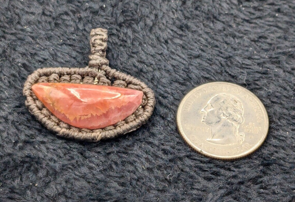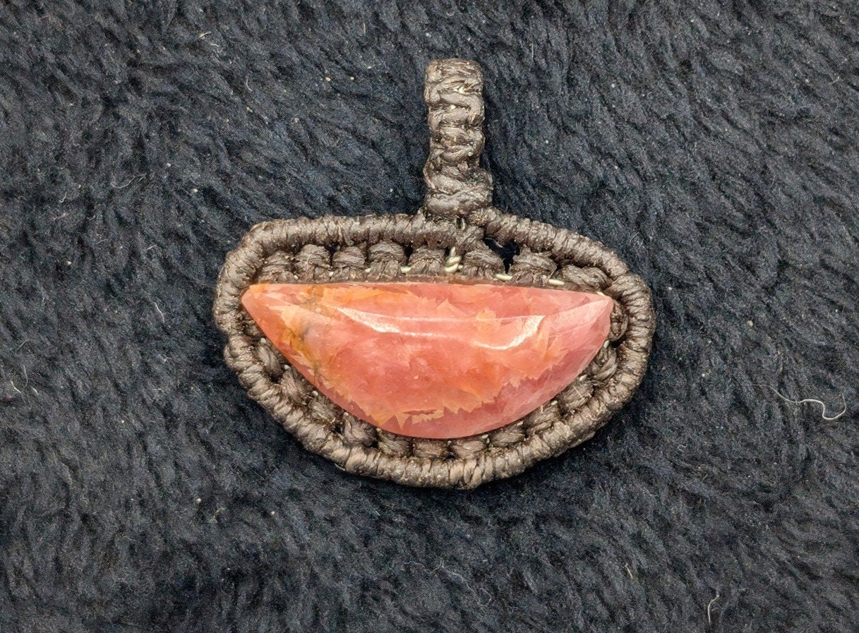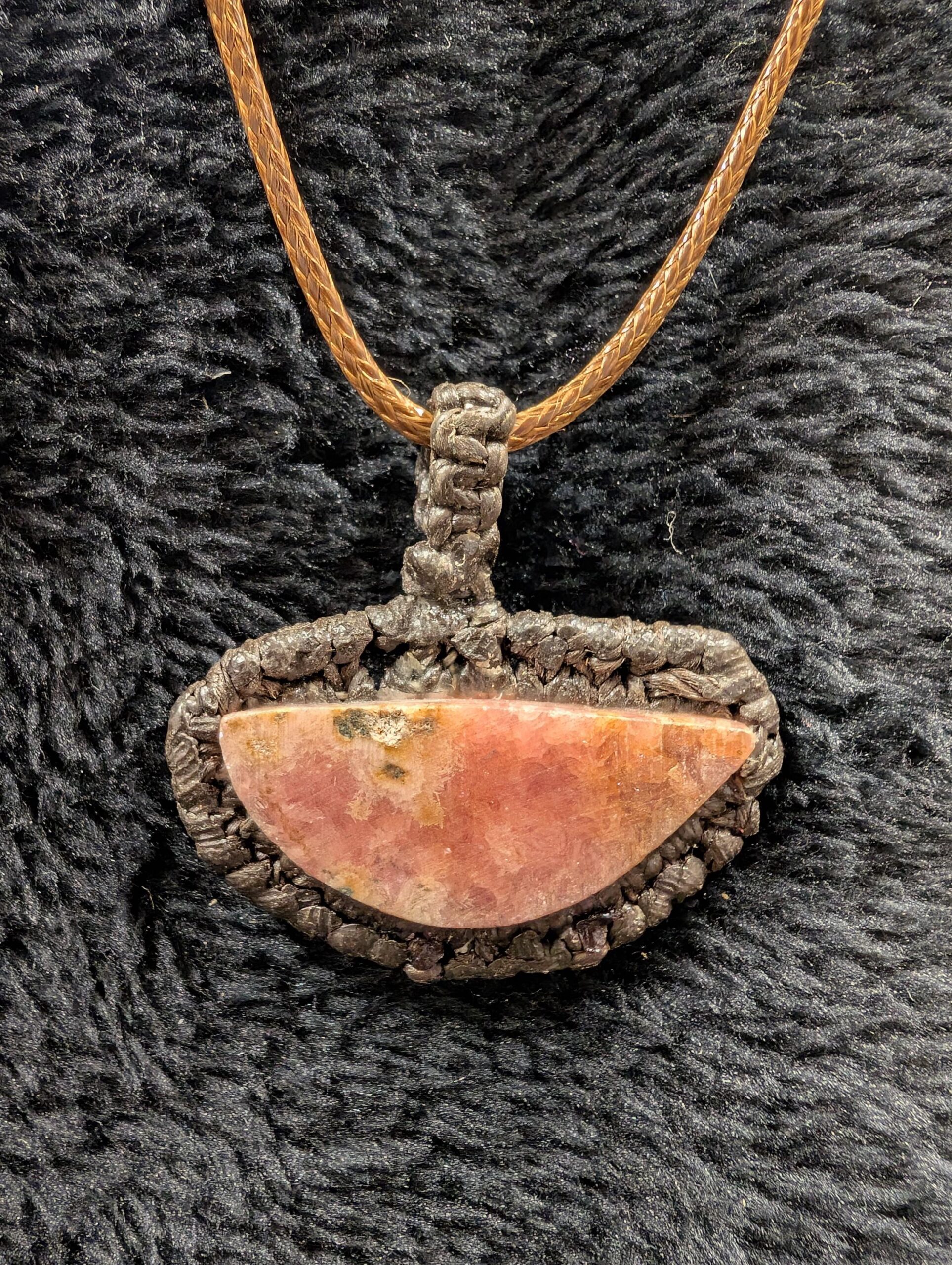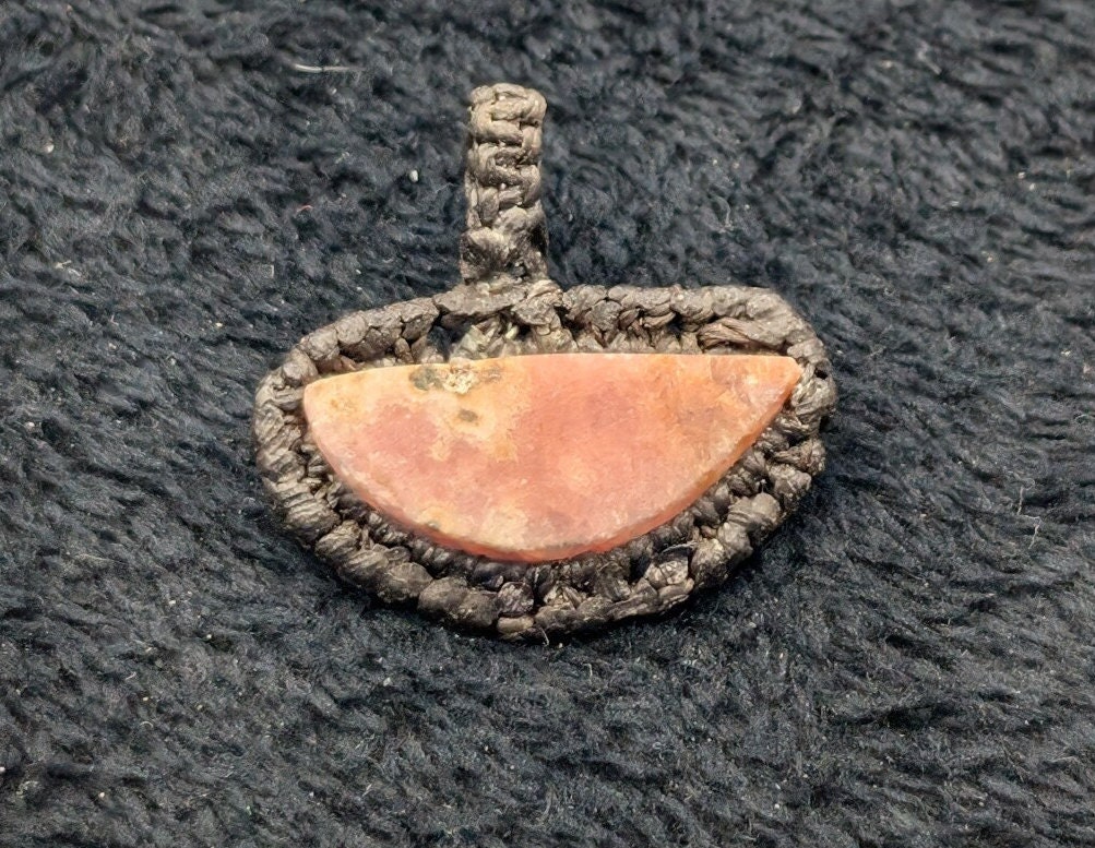 Handcrafted Cord-Wrapped Design: The rhodochrosite is expertly wrapped with durable cord, enhancing its rustic appeal while securely showcasing the gemstone's natural beauty. The craftsmanship highlights the stone's organic shape and texture.