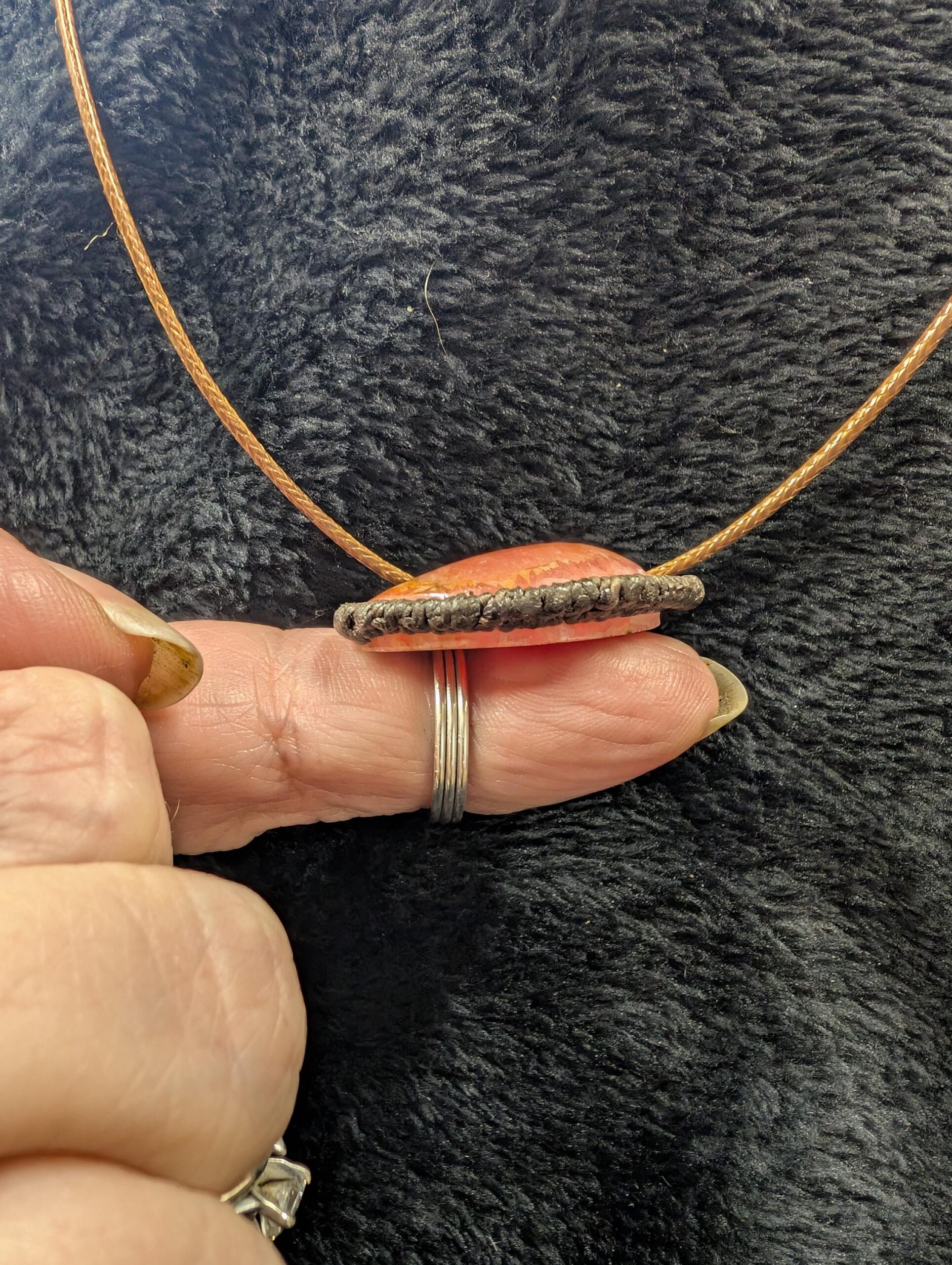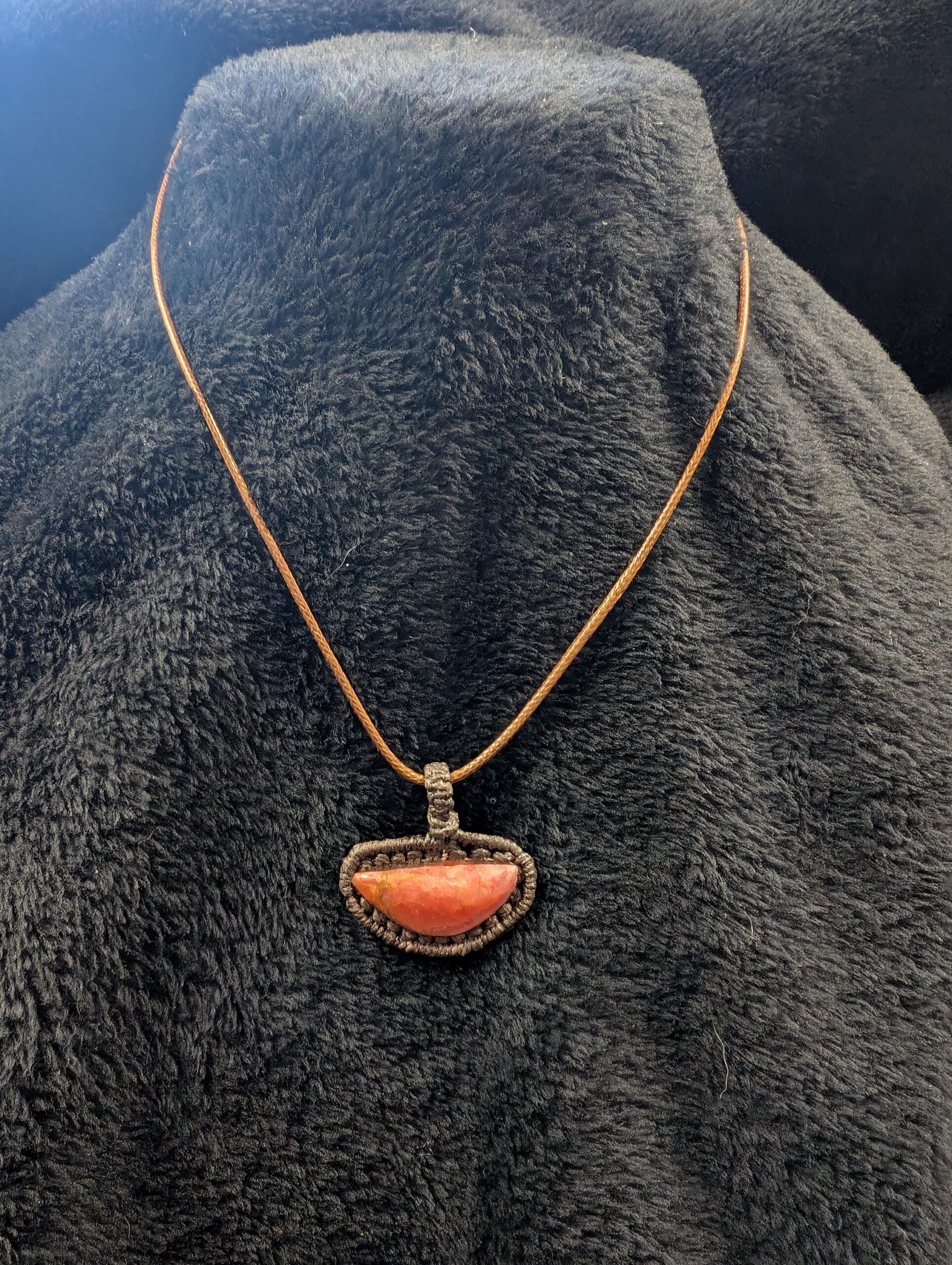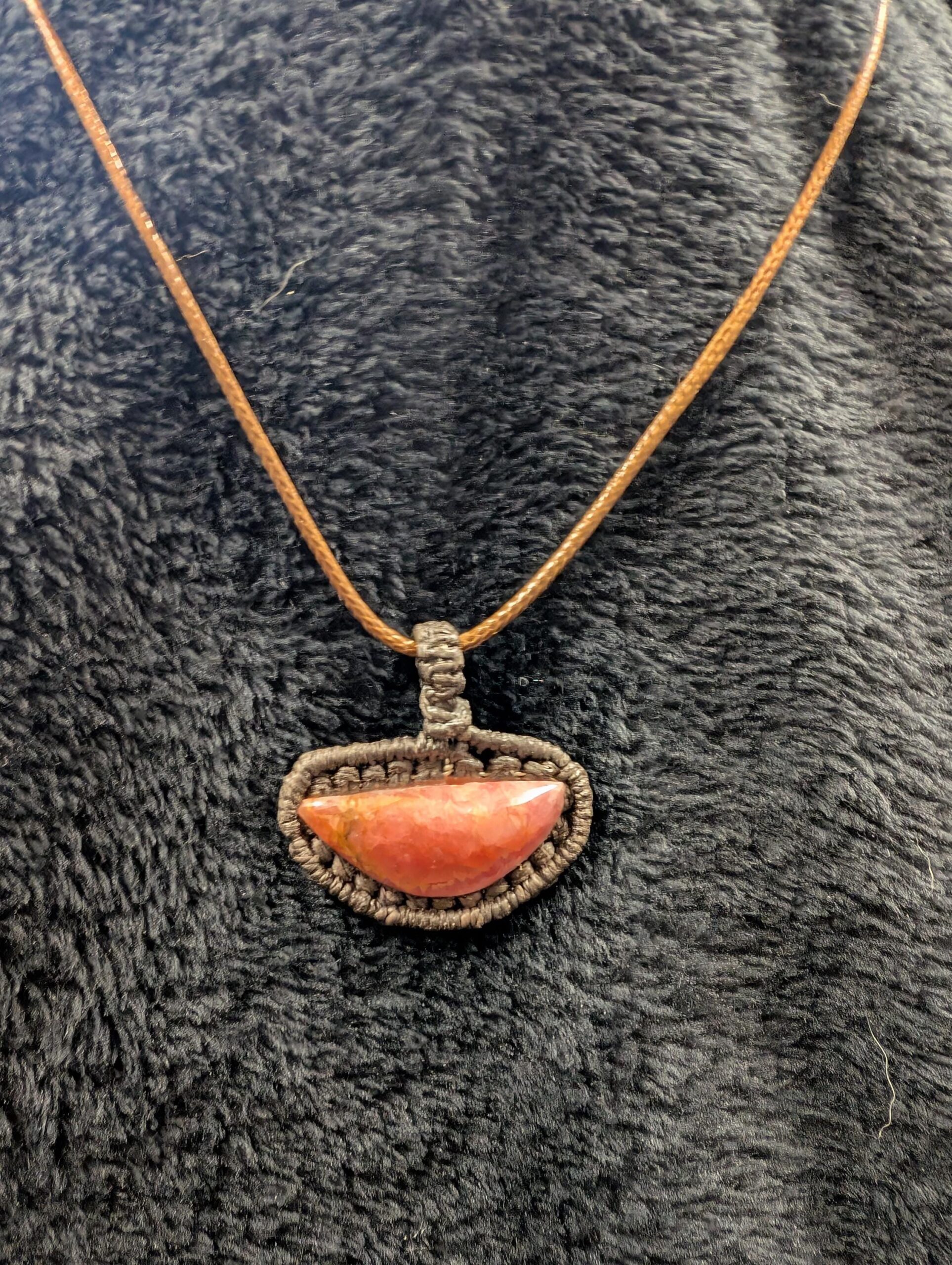 Embrace the natural beauty and rustic charm of this handmade vintage red rhodochrosite pendant, elegantly suspended from an adjustable brown cord necklace. This unique piece combines earthy aesthetics with timeless elegance, making it a standout addition to any jewelry collection.