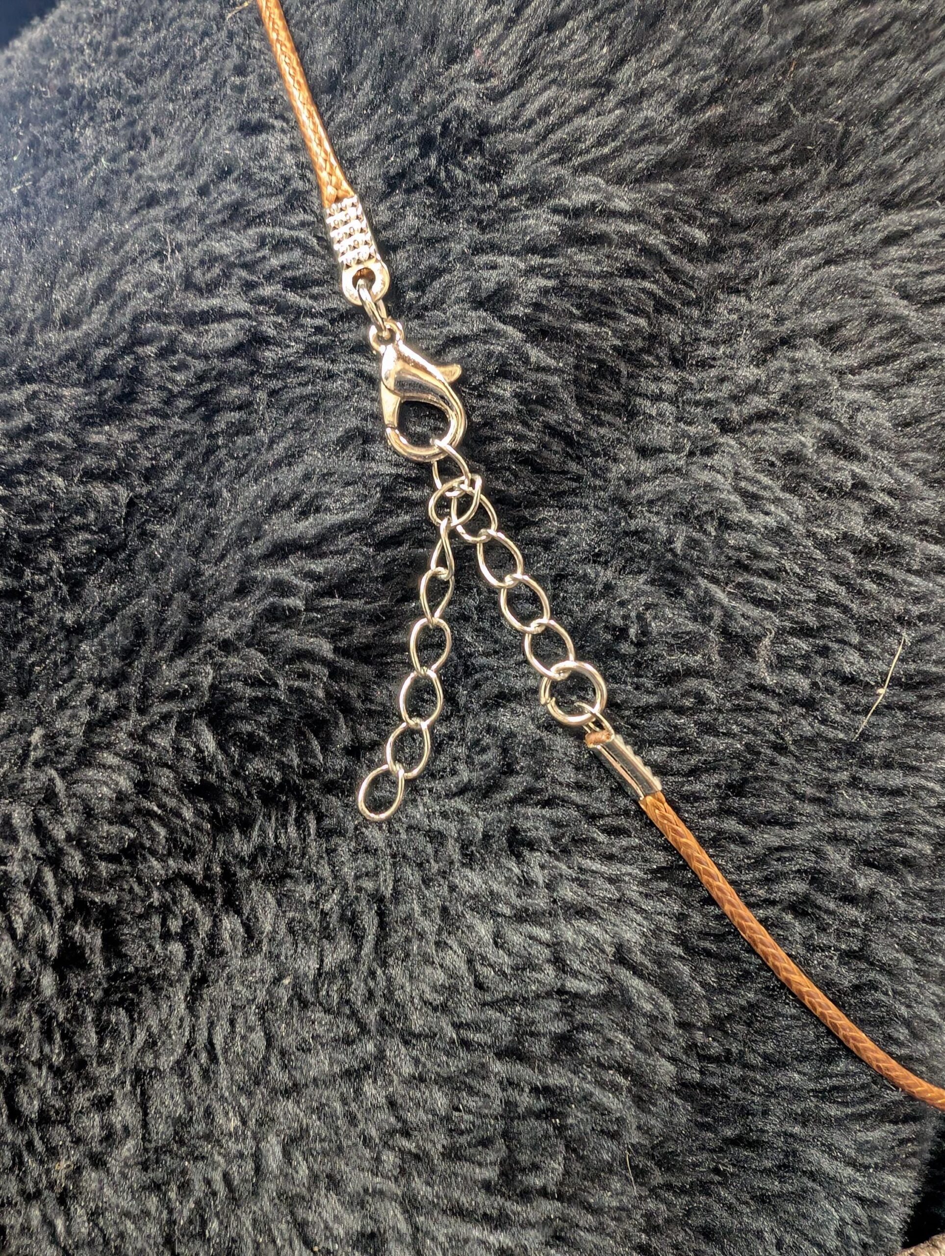 Adjustable Brown Cord Necklace: The pendant hangs from a brown cord necklace, adjustable between 18 to 20 inches, allowing for versatile styling to suit various necklines and preferences. The earthy tone of the cord complements the warm hues of the rhodochrosite.