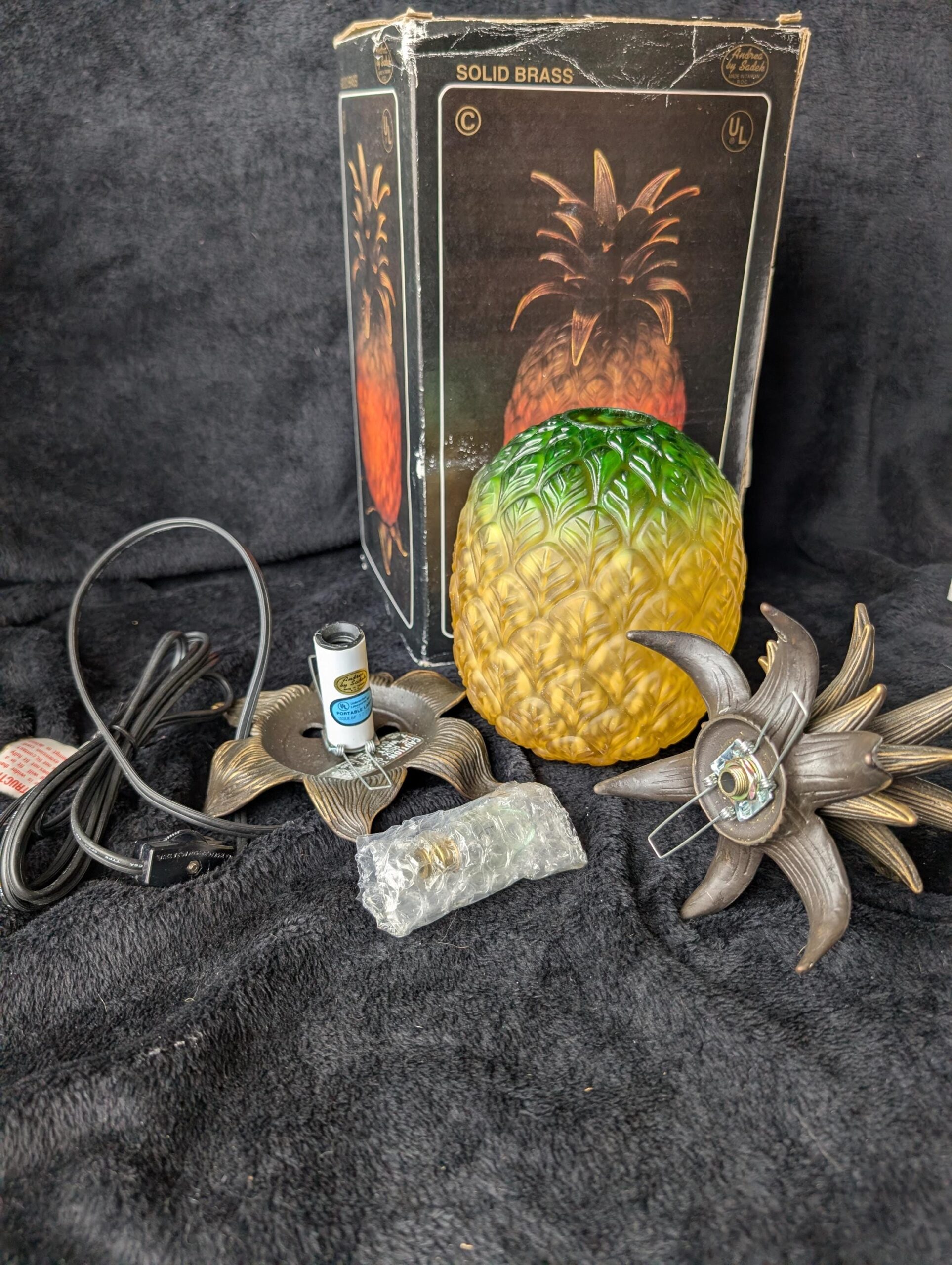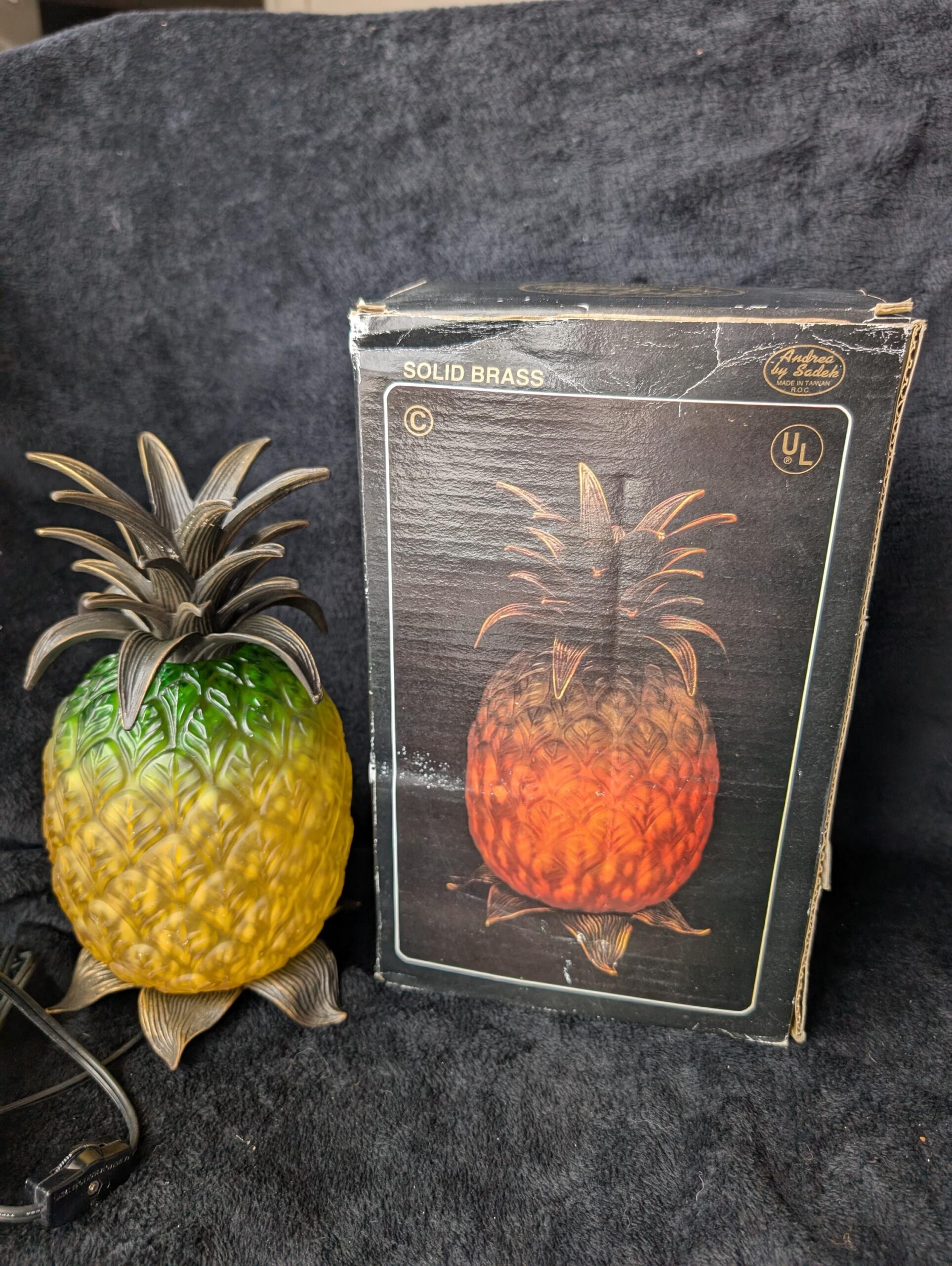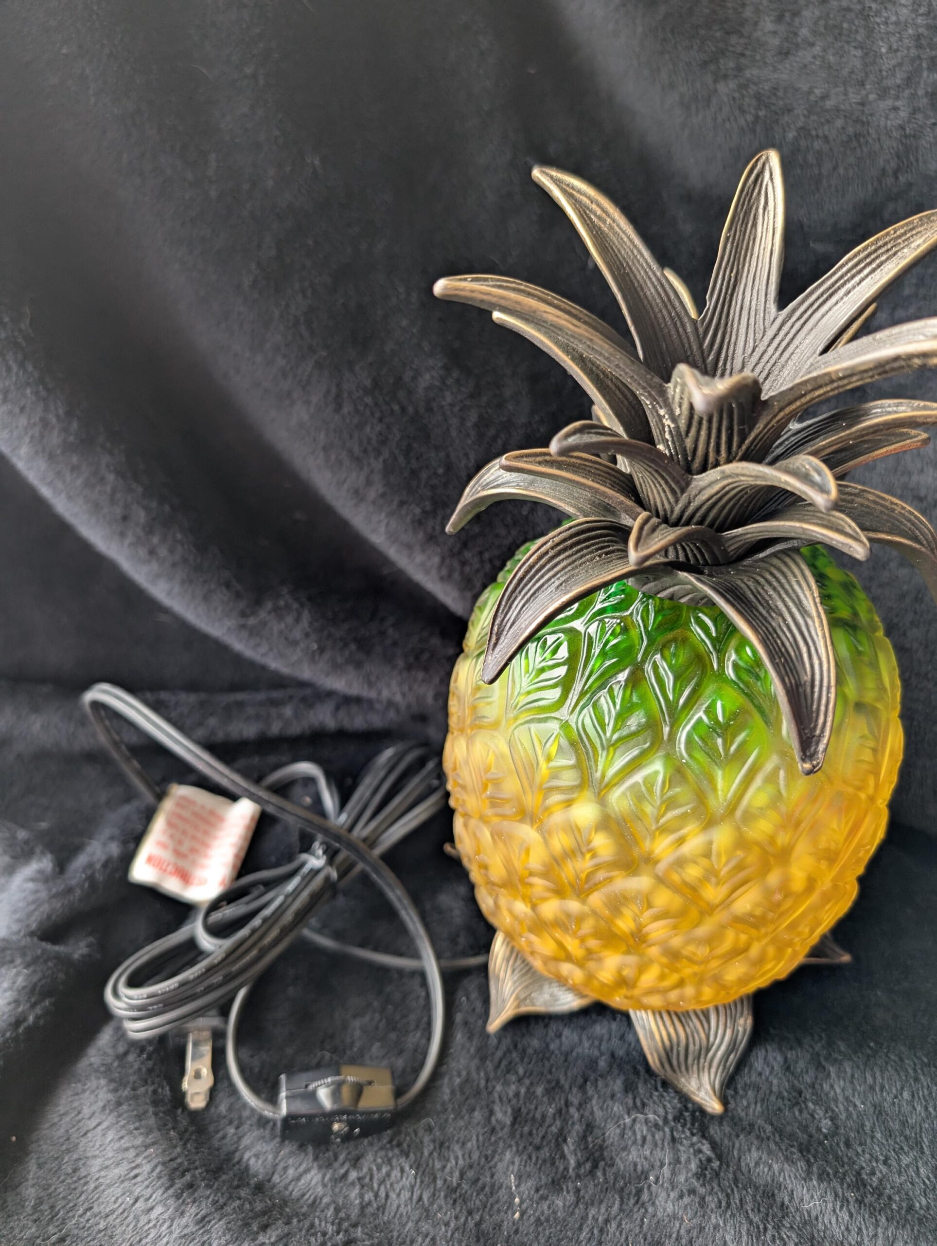 Light up your space with this vintage Andrea by Sadek pineapple lamp, a timeless symbol of warmth and hospitality. Featuring a vibrant yellow and green glass body with intricate metal leaves, this lamp blends tropical charm with classic elegance. This vintage piece is in pristine condition, still new in its original box, making it a rare find for collectors and decor enthusiasts.