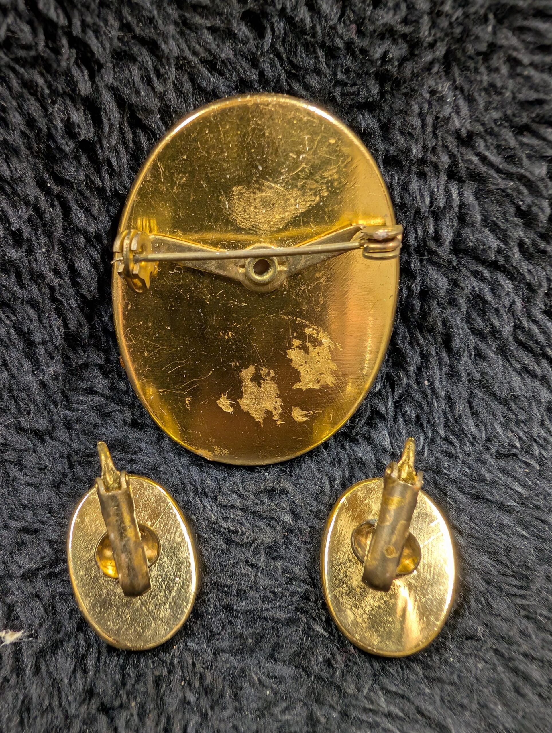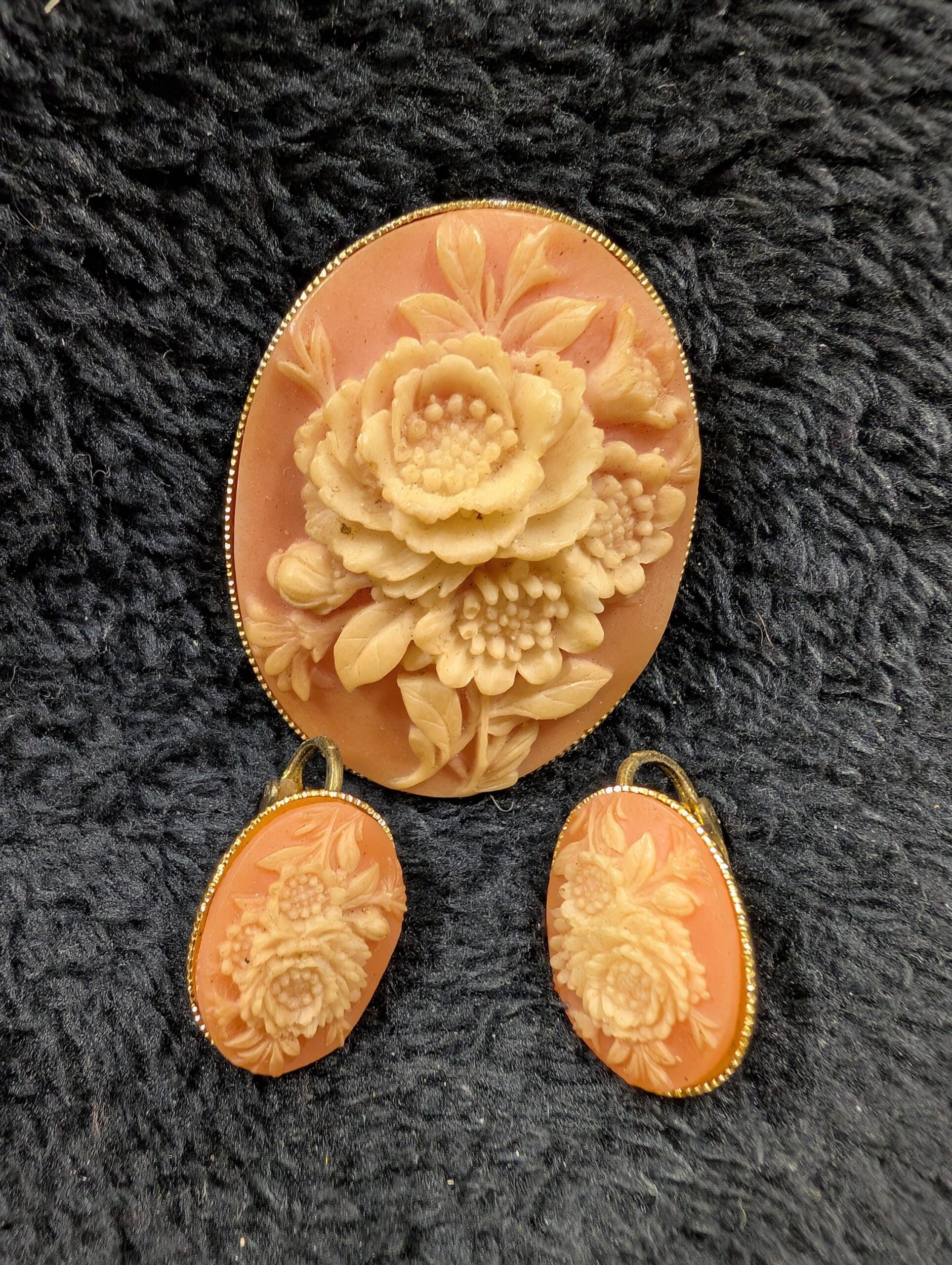 2️⃣ Two-Tone Cameo Brooch with Matching Clip-On Earrings – This romantic vintage set features an intricately carved floral cameo in soft golden hues, paired with matching clip-on earrings for a coordinated, classic look. Perfect for those who love delicate, feminine vintage jewelry.