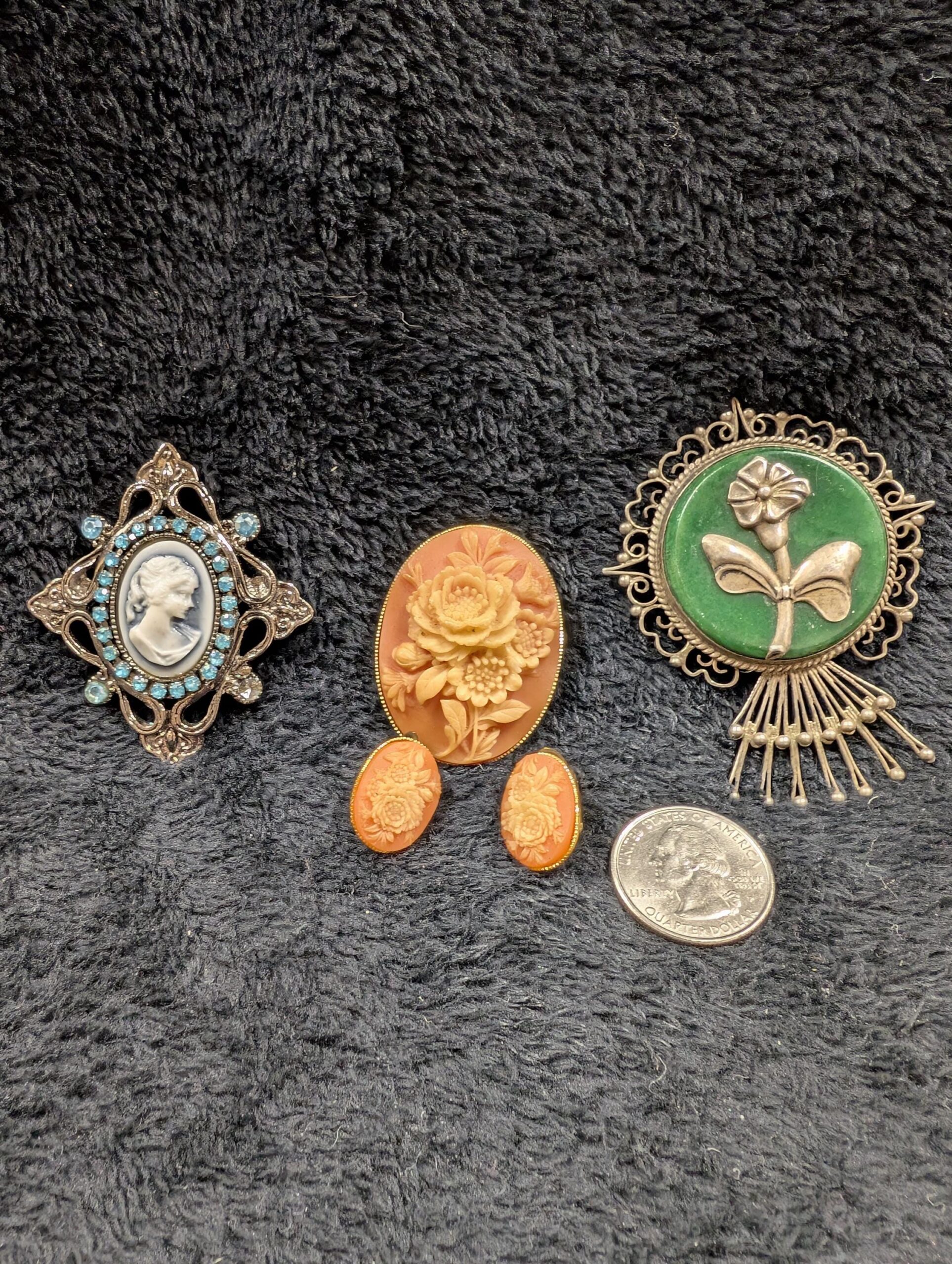 A Treasure Trove of Vintage Elegance! Select your favorite from this charming trio of vintage brooches, each with its own unique appeal. Whether you adore the classic beauty of a cameo, the intricate details of sterling silver, or a touch of gemstone elegance, there's something special waiting for you!