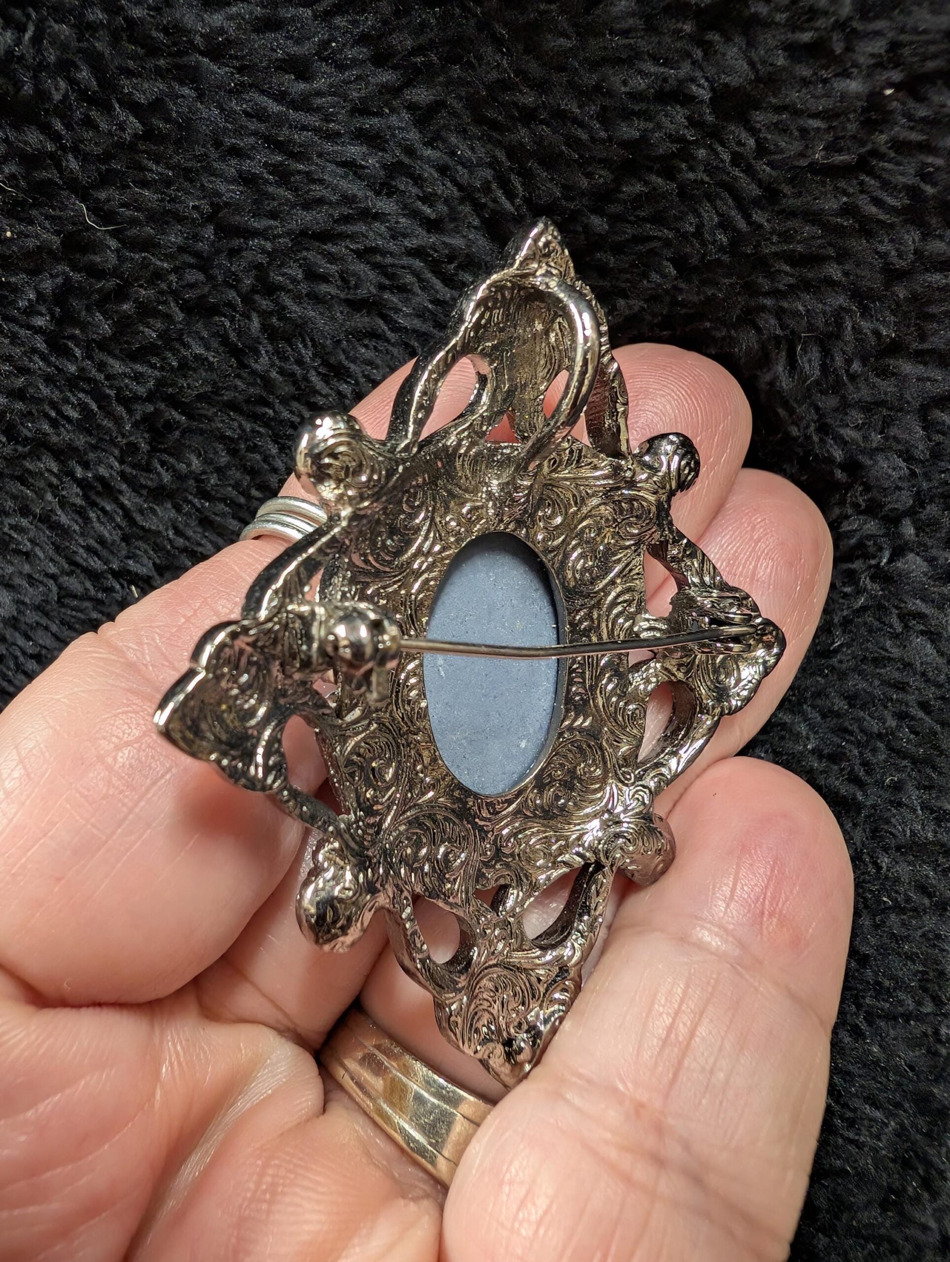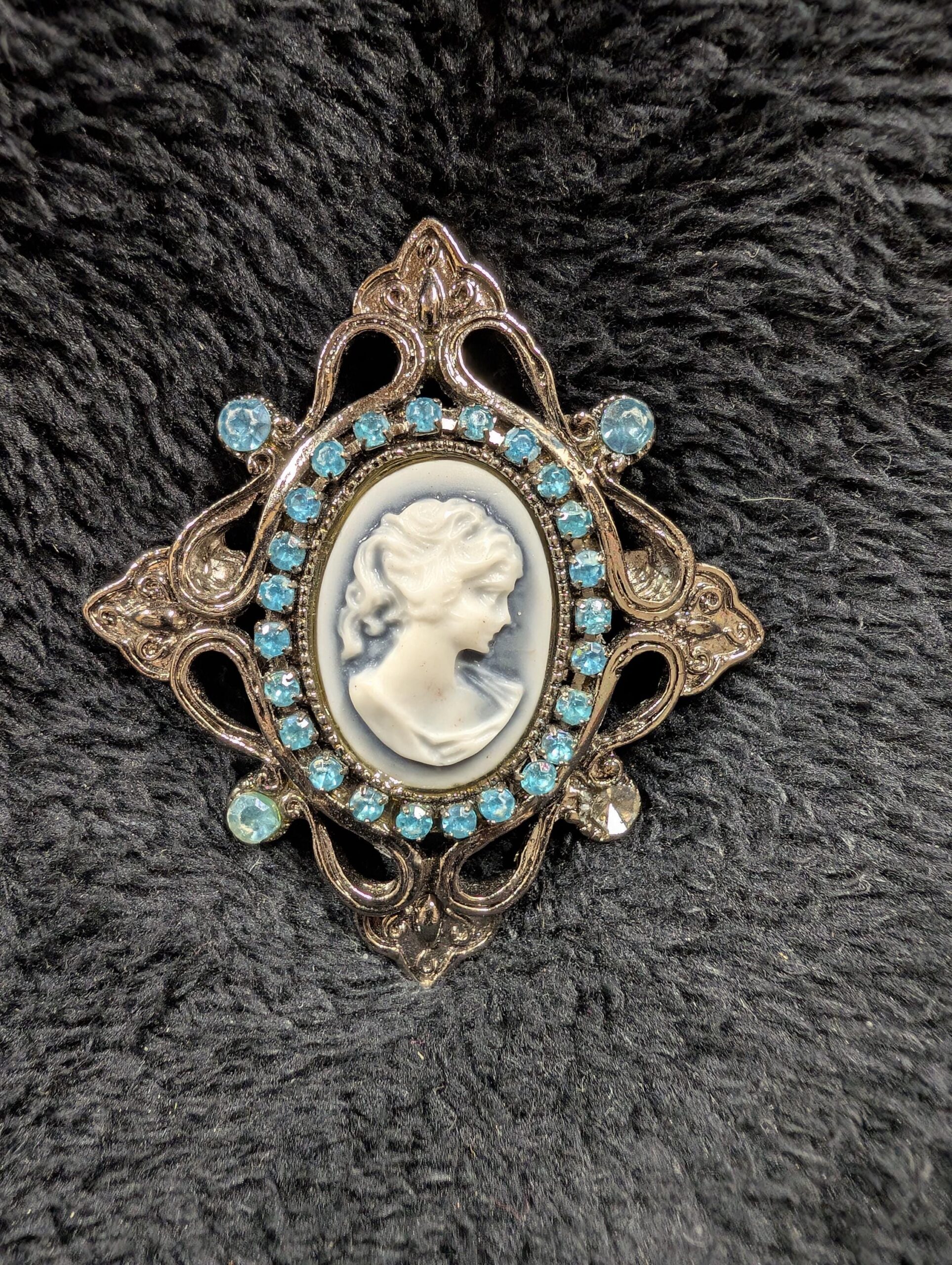 1️⃣ 1990s Silver-Tone Cameo Brooch/Pendant with Blue Rhinestones – A lovely vintage cameo with a delicate filigree setting and sparkling blue rhinestones. Note: one rhinestone is missing on the bottom right, but it still shines beautifully! Can be worn as a brooch or pendant for versatile styling.
