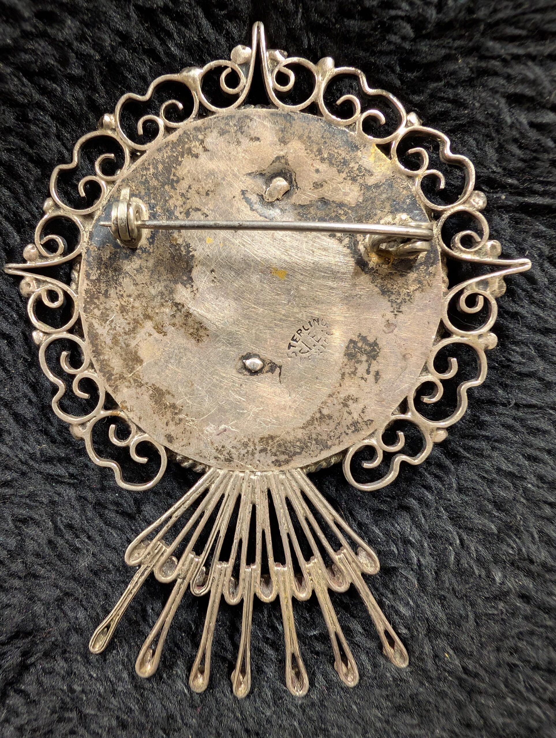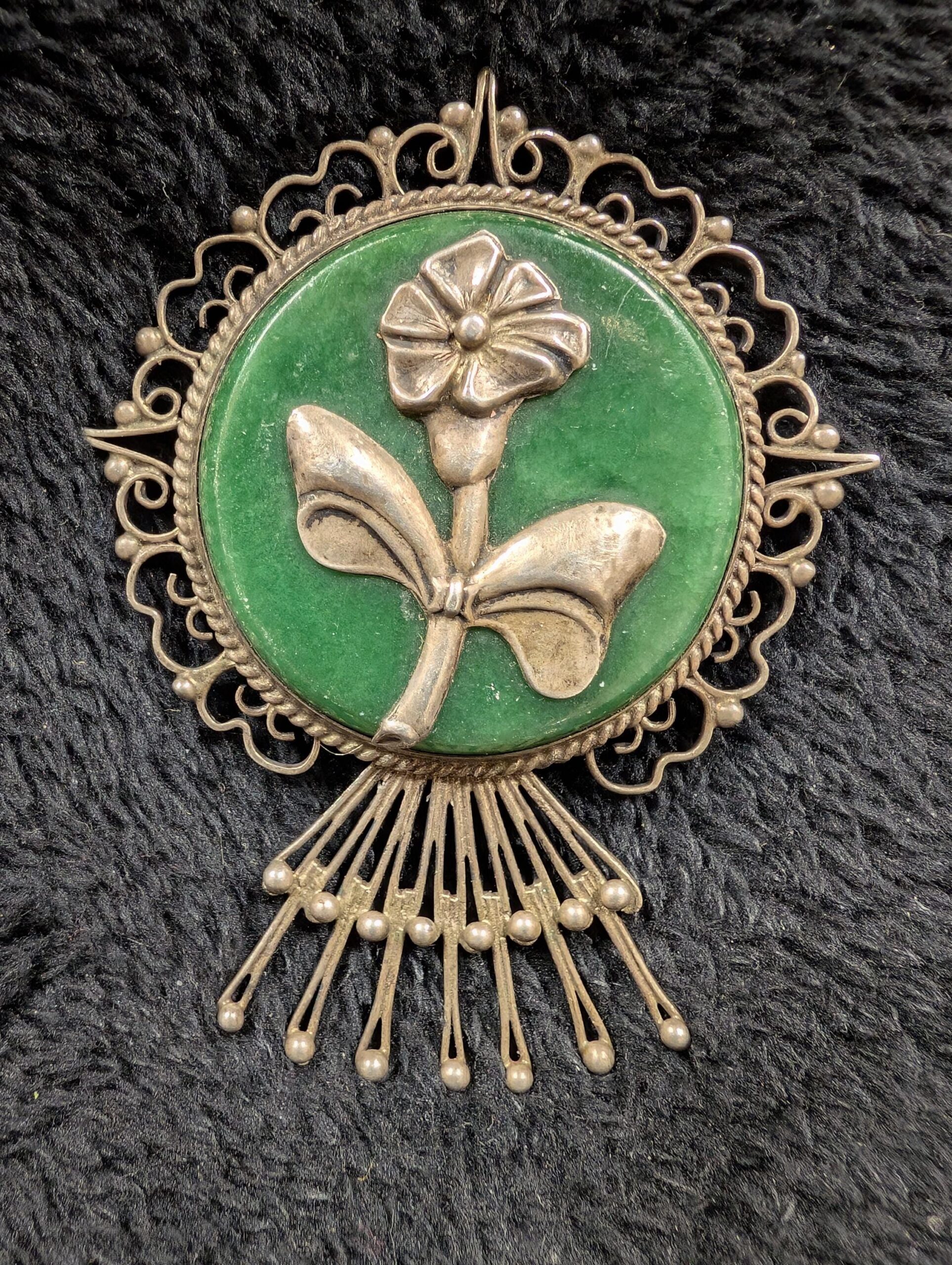 3️⃣ Sterling Silver & Green Stone Floral Brooch (Marked J.E. Mexico) – A stunning sterling silver brooch, featuring a jade-like or green agate-style stone adorned with an elegant floral design. Marked J.E. Mexico, this piece has a gorgeous Art Nouveau or artisan look, adding timeless sophistication to any outfit.