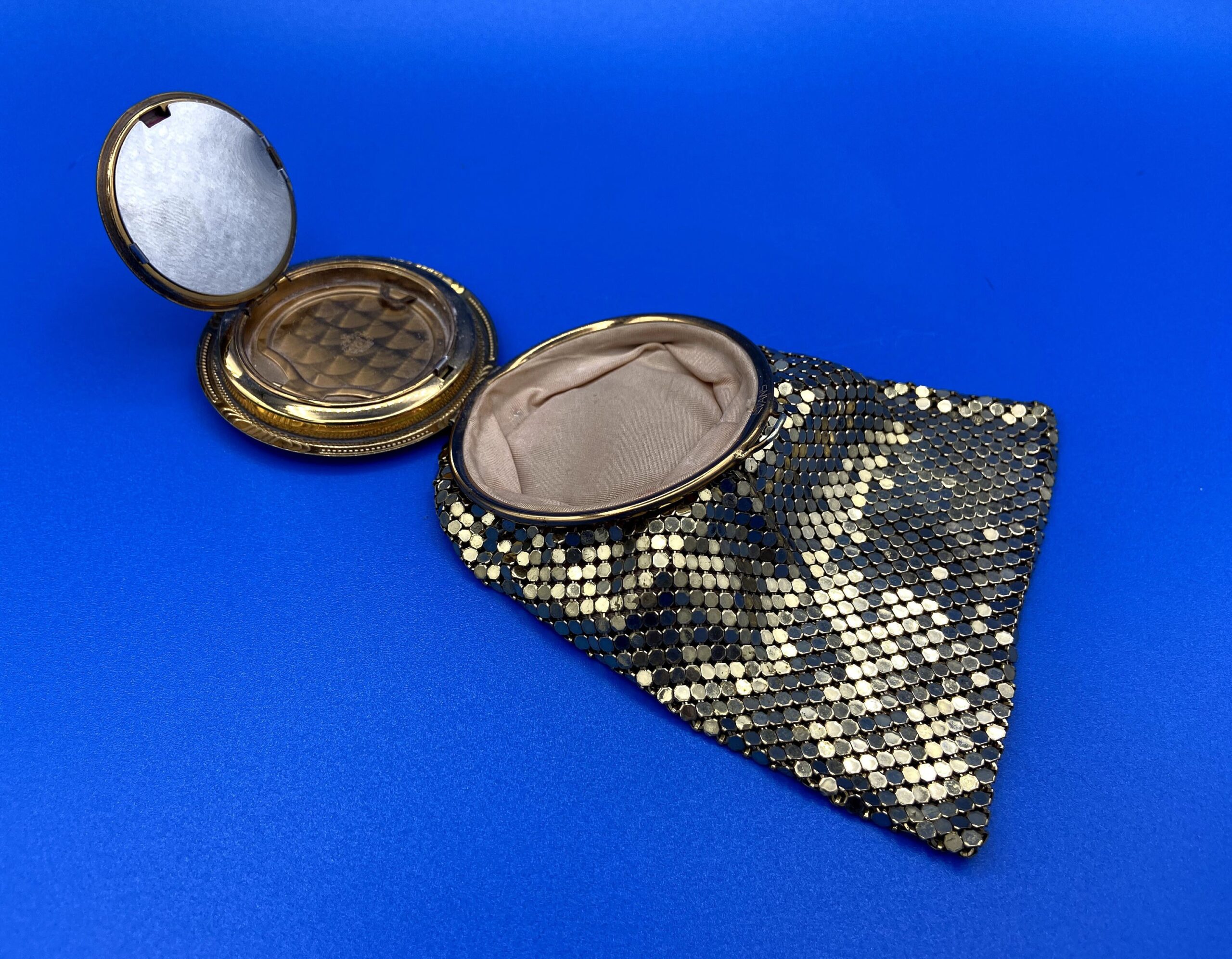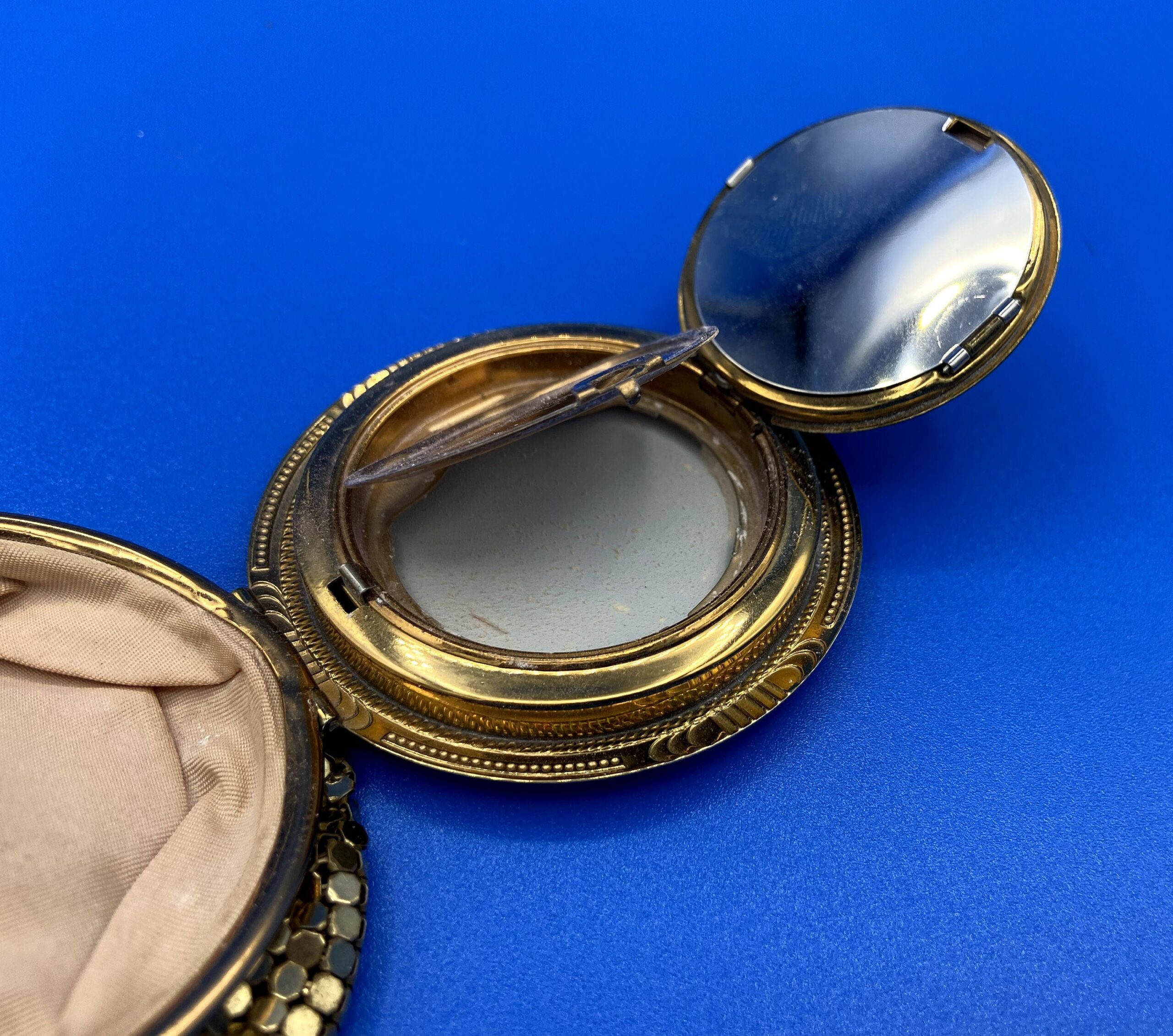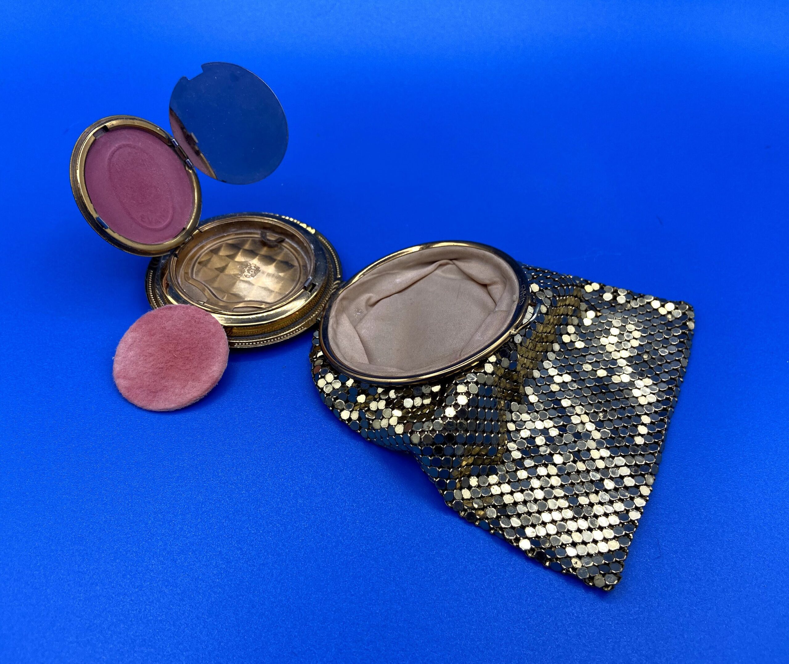 Great vintage compact with attached purse/pouch. Compact has a two-sided mirror and two compartments, one for powder, one for blush. Original blush puff included.