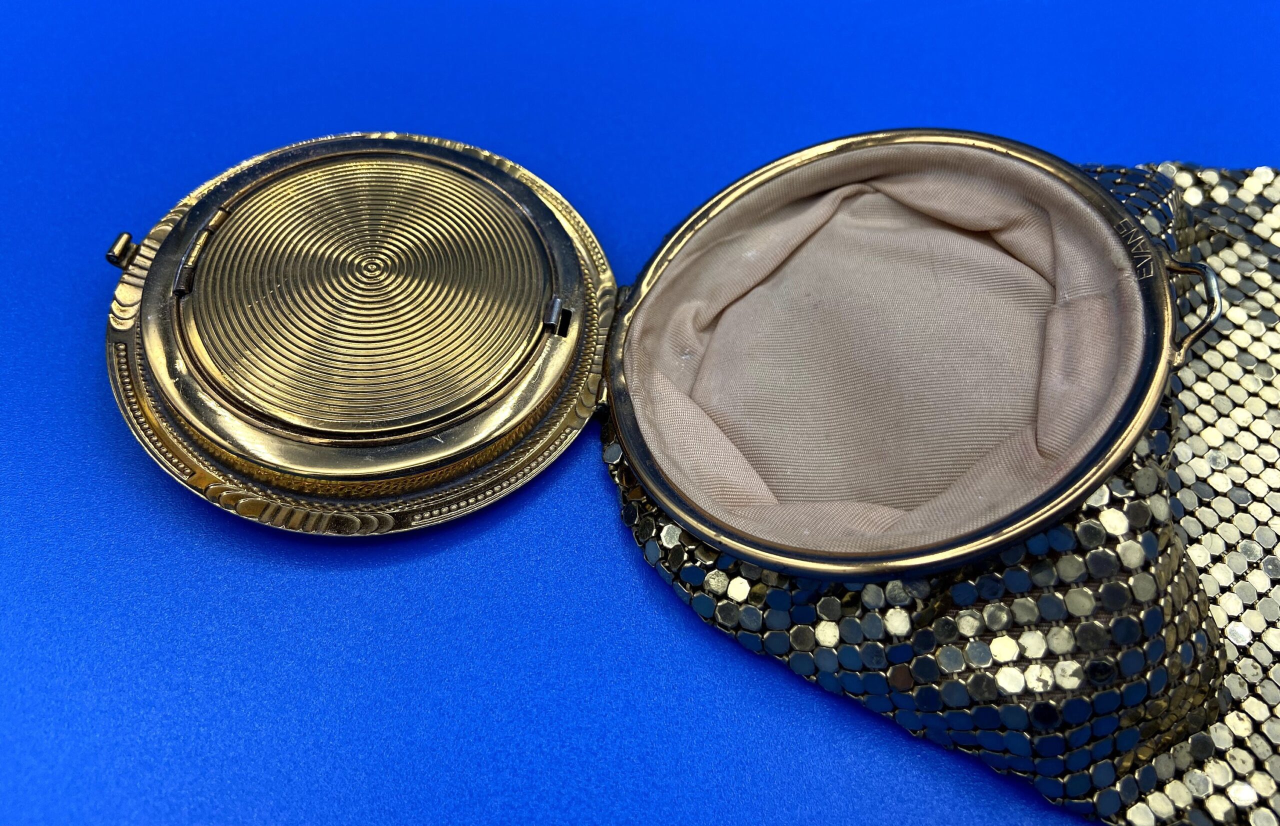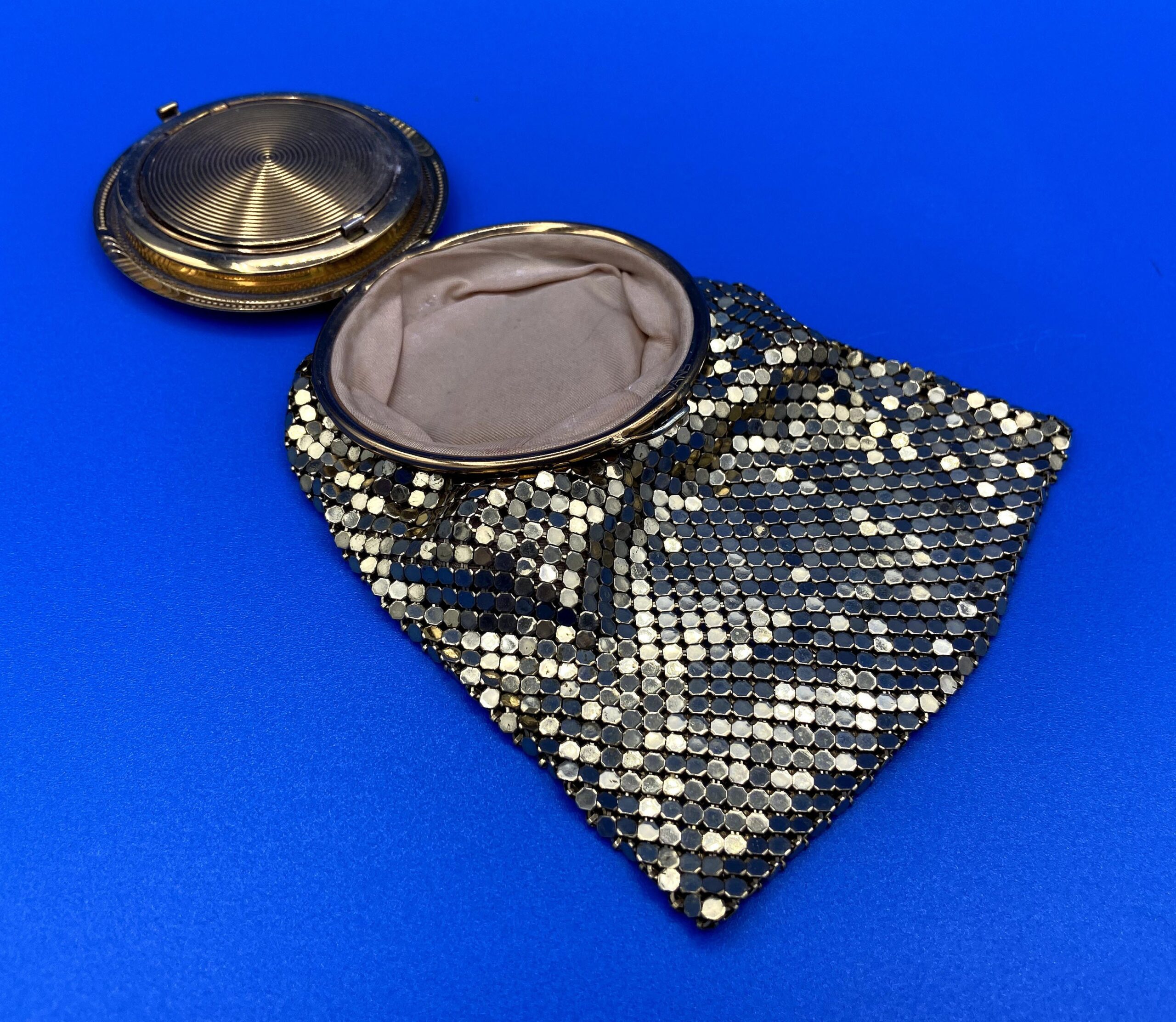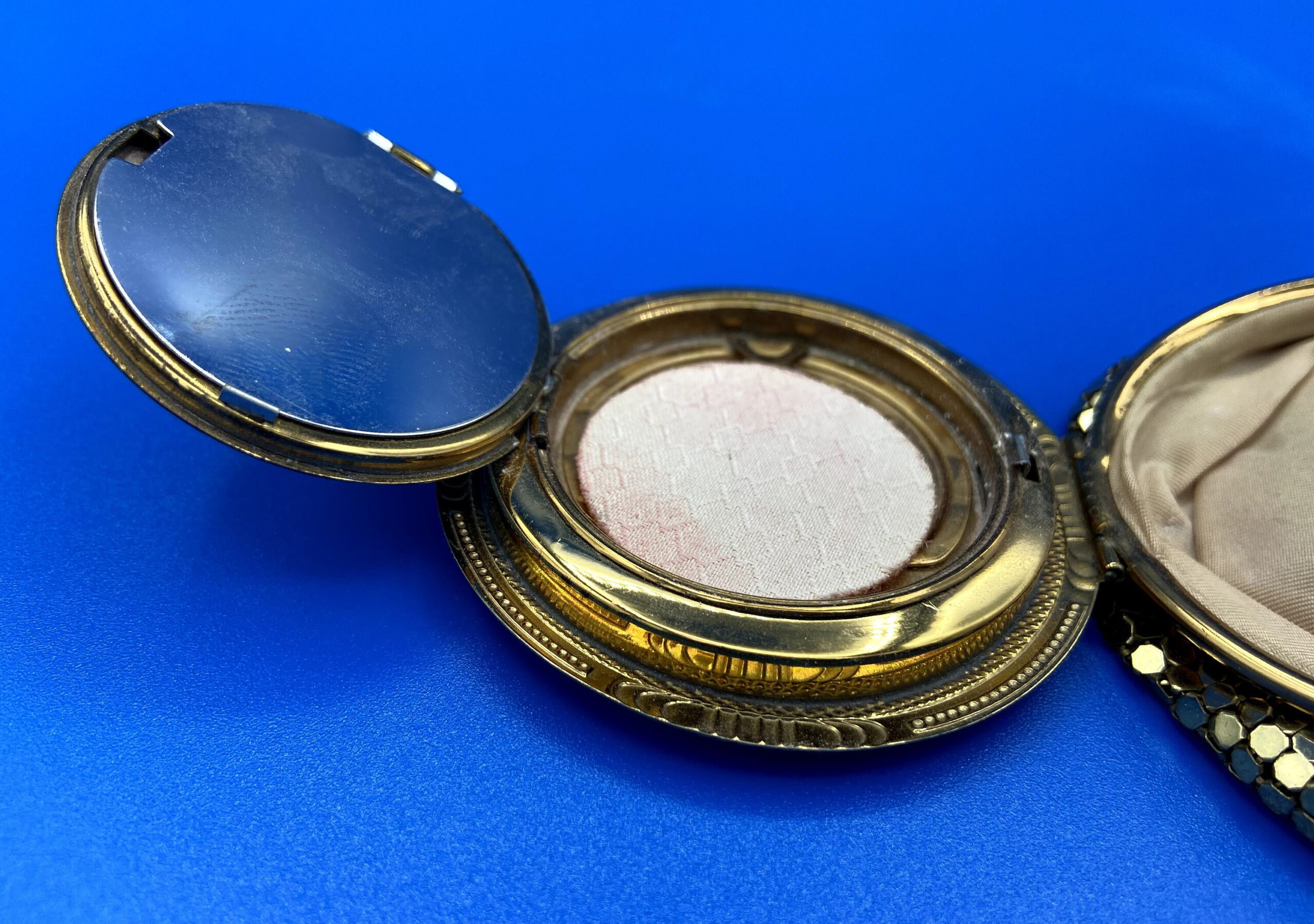 Great vintage compact with attached purse/pouch. Compact has a two-sided mirror and two compartments, one for powder, one for blush. Original blush puff included.