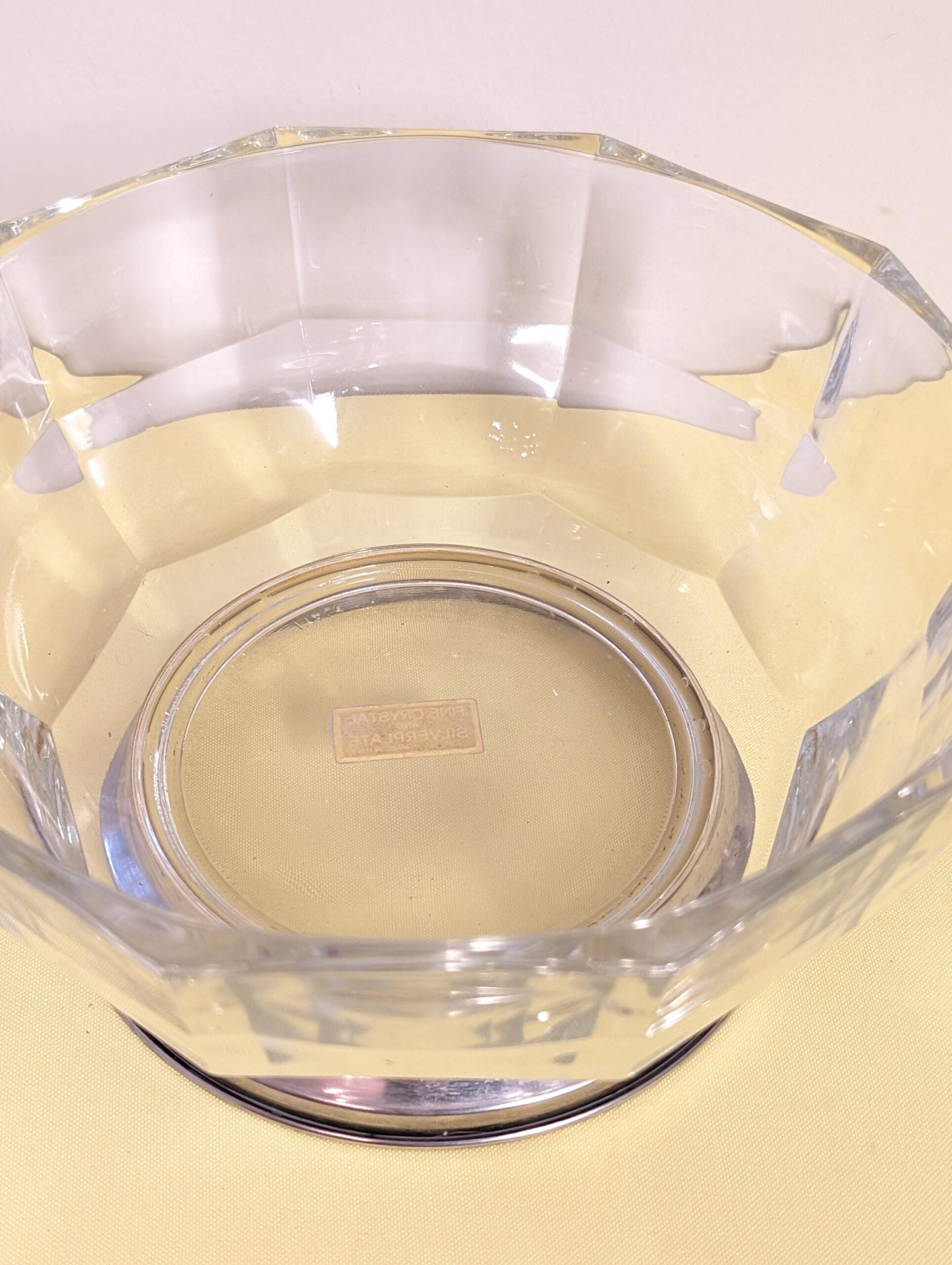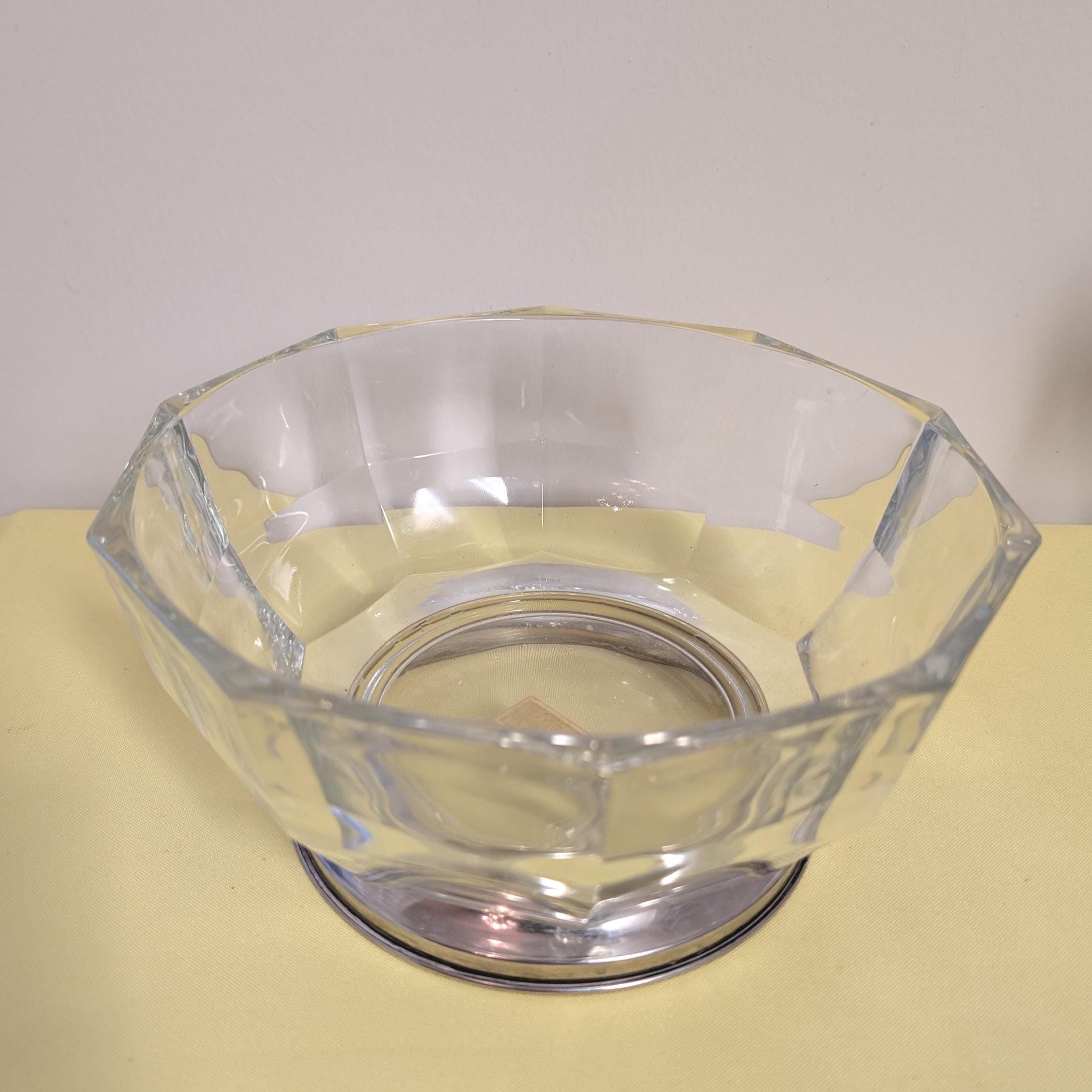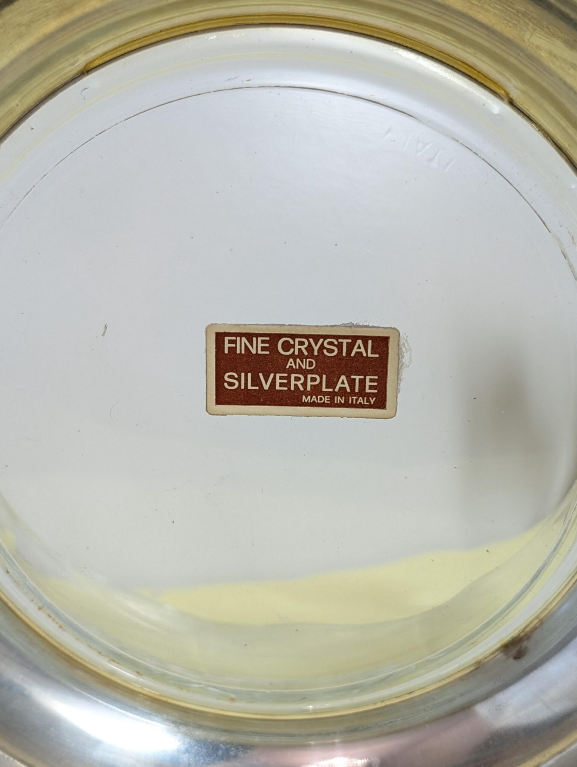 Timeless charm and Italian craftsmanship meet in this exquisite vintage crystal bowl, made in Italy and featuring a gleaming silver-plated ringed base. With its multi-faceted geometric sides and substantial weight, this bowl exudes refinement and makes a striking addition to any dining table, buffet, or vanity. The original sticker reads “Fine Crystal and Silverplate – Made in Italy,” and the bowl's wide mouth and 4-inch height make it ideal for serving, decorating, or gifting.
