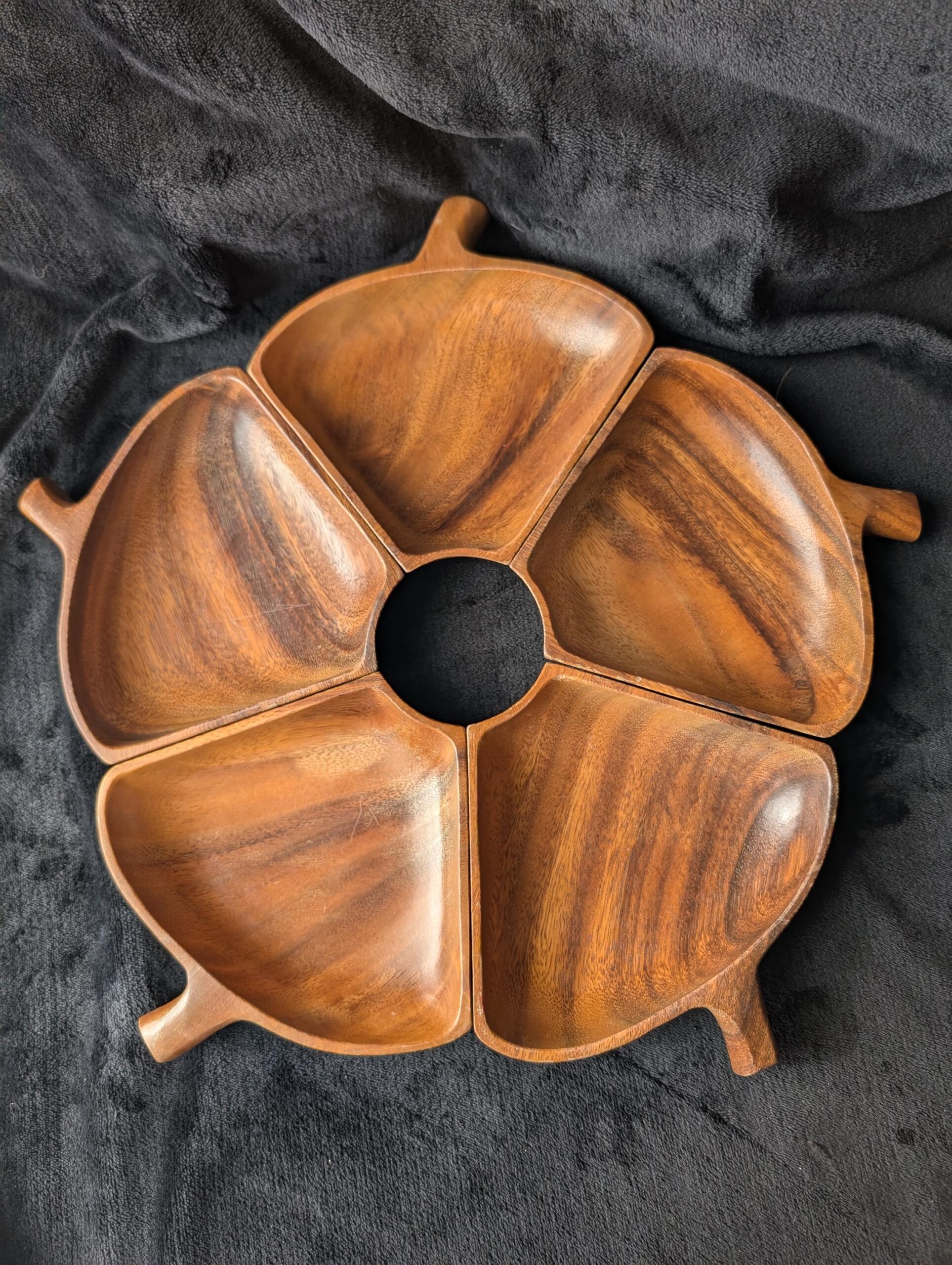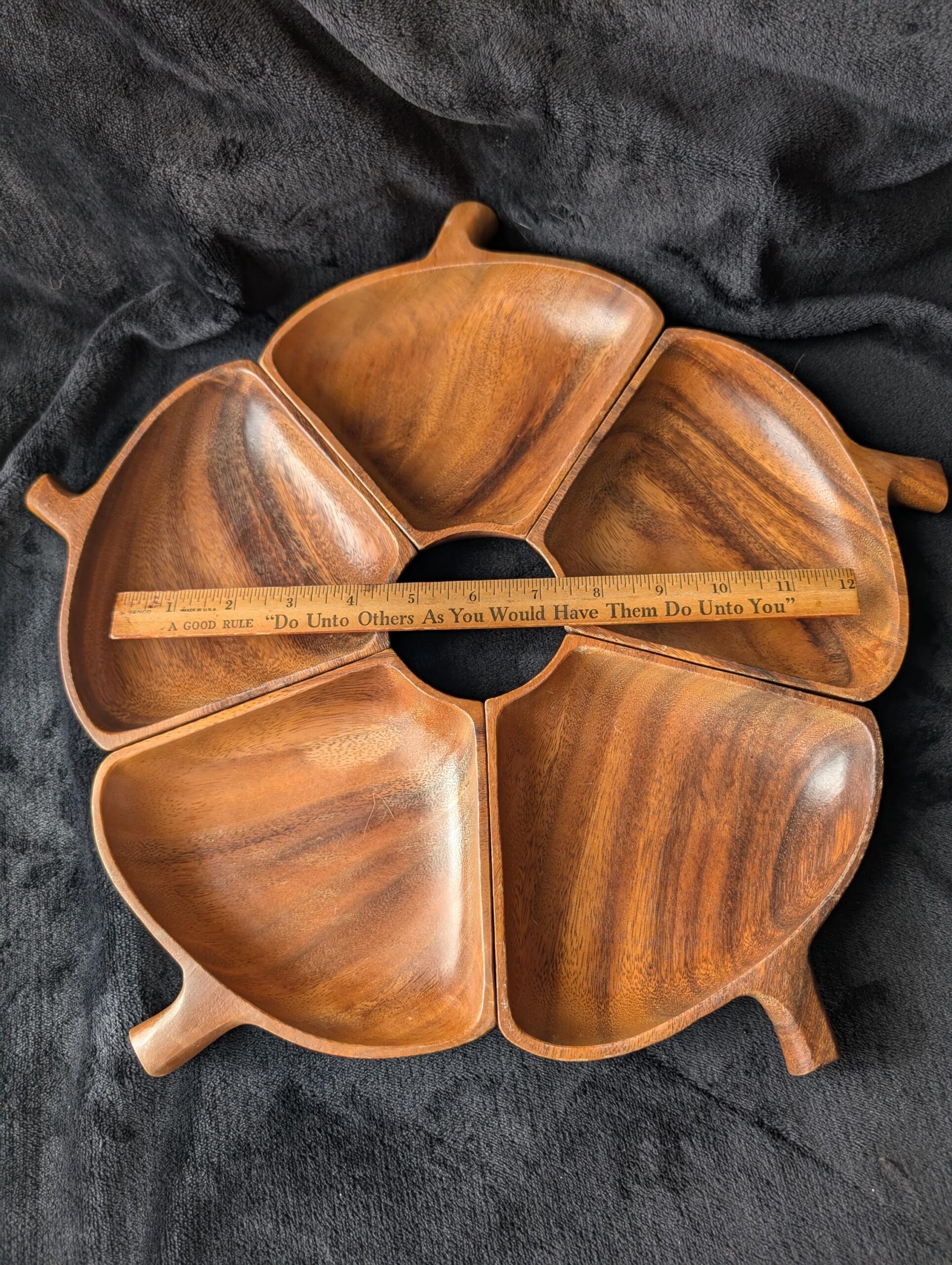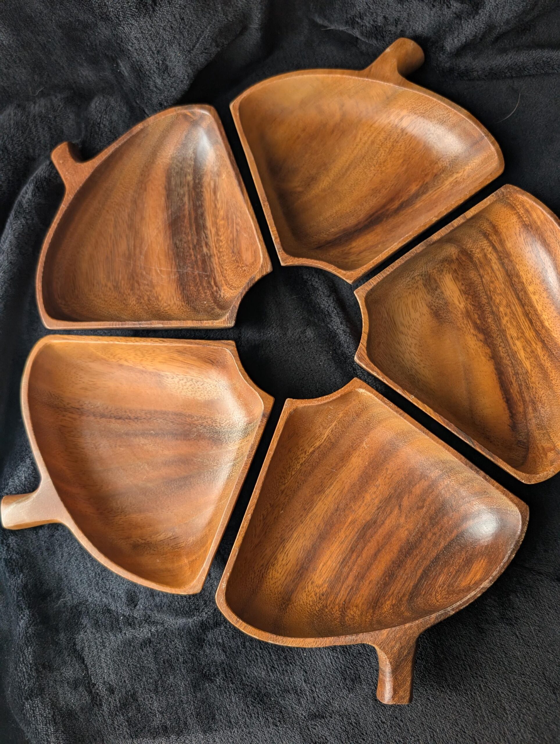 Entertain in true mid-century style with this vintage Monkey Pod wood snack bowl set, designed to add a warm, organic touch to your serving experience. Crafted from beautifully grained tropical hardwood, these five leaf-shaped bowls fit together to form a striking circular serving arrangement, perfect for snacks, nuts, candy, or appetizers at your next gathering.