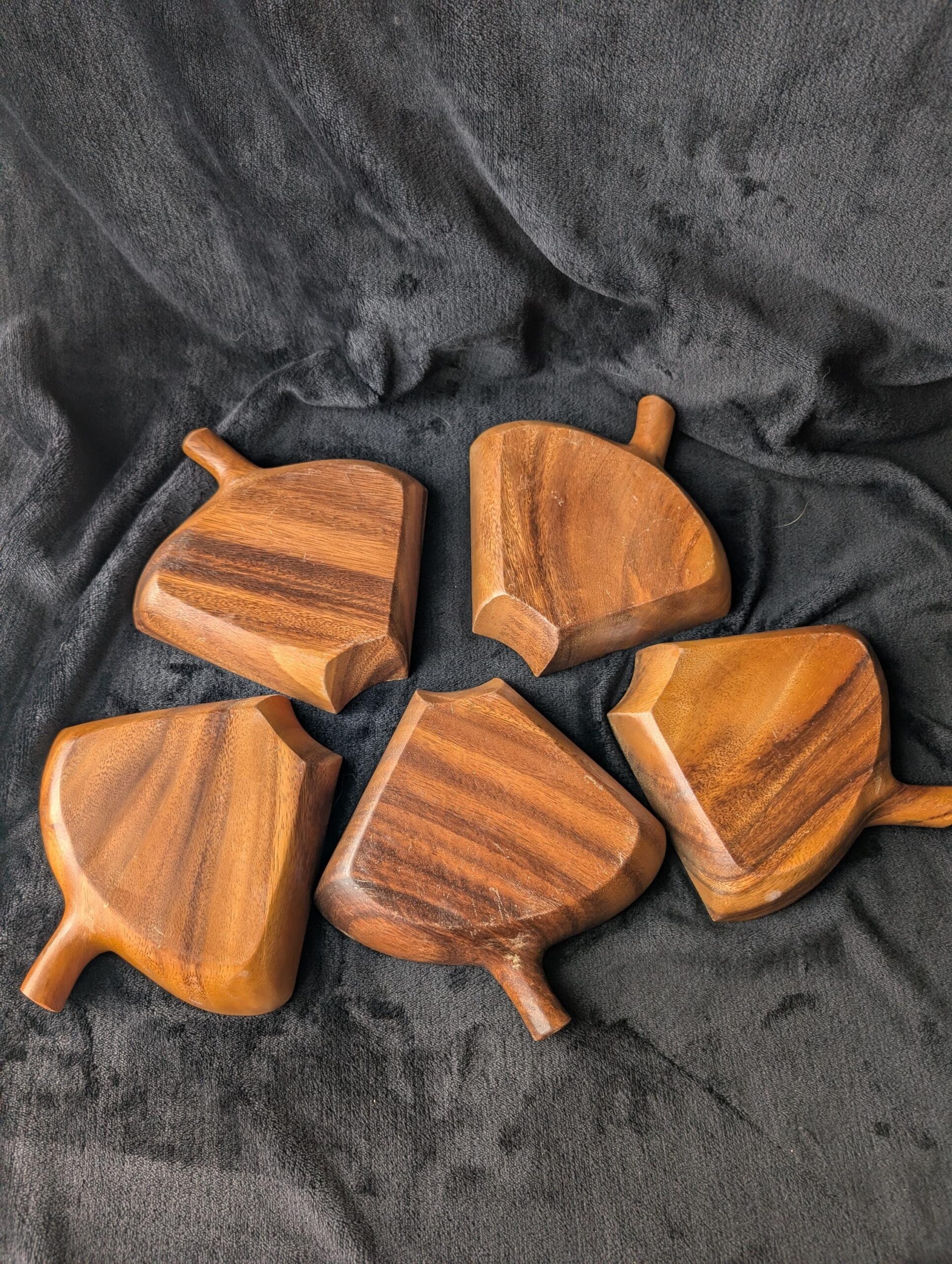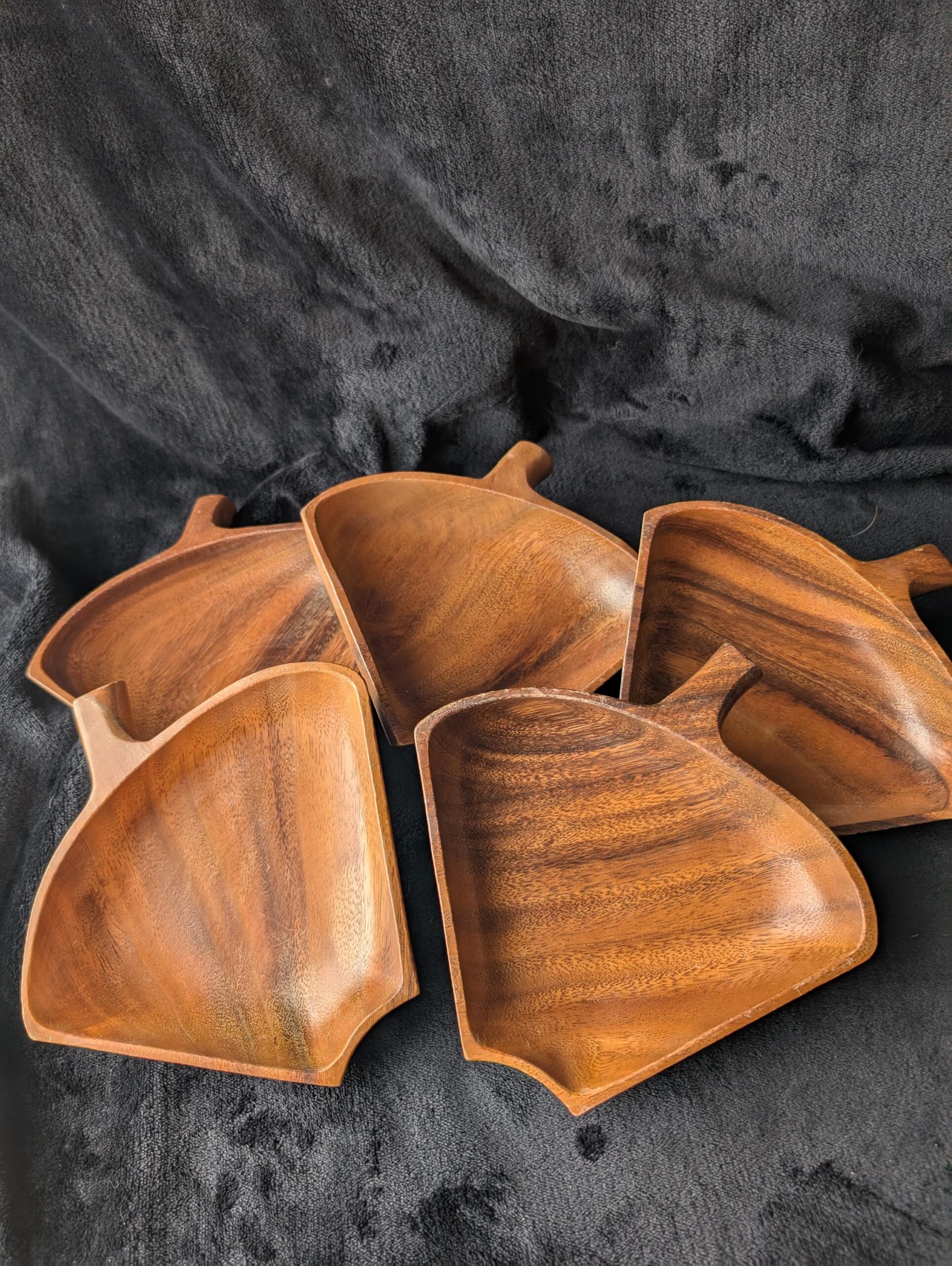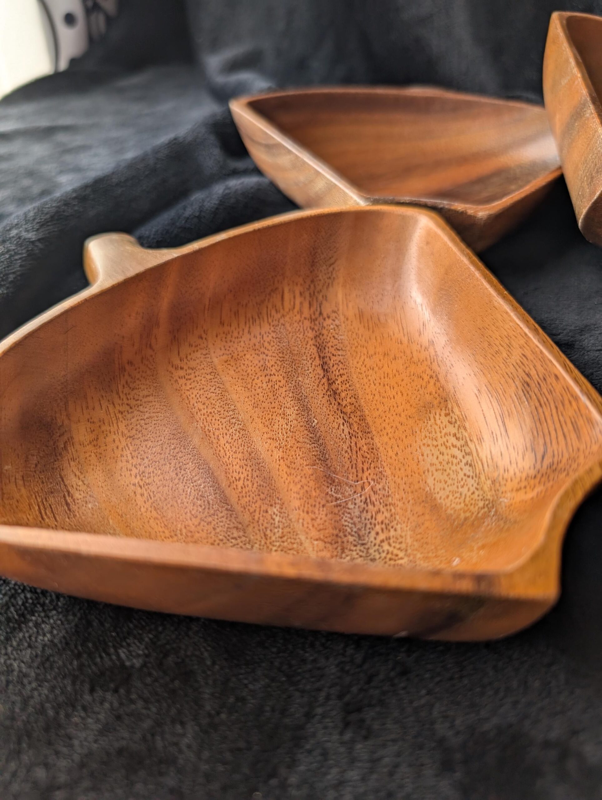 Entertain in true mid-century style with this vintage Monkey Pod wood snack bowl set, designed to add a warm, organic touch to your serving experience. Crafted from beautifully grained tropical hardwood, these five leaf-shaped bowls fit together to form a striking circular serving arrangement, perfect for snacks, nuts, candy, or appetizers at your next gathering.