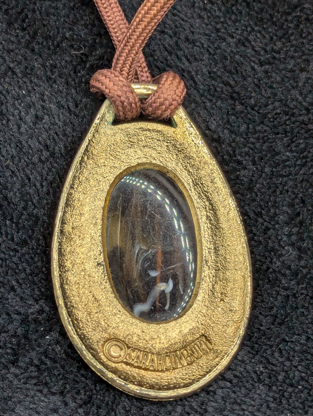 A Stunning Retro Sarah Coventry Pendant! This vintage Sarah Coventry necklace features a teardrop-shaped gold-tone pendant, framing a faux tiger eye glass cabochon with warm brown and golden streaks. Suspended from a 26-inch brown cord with gold-tone accents, this 1970s statement piece exudes vintage charm and timeless style.
