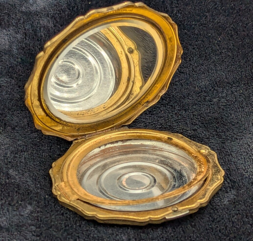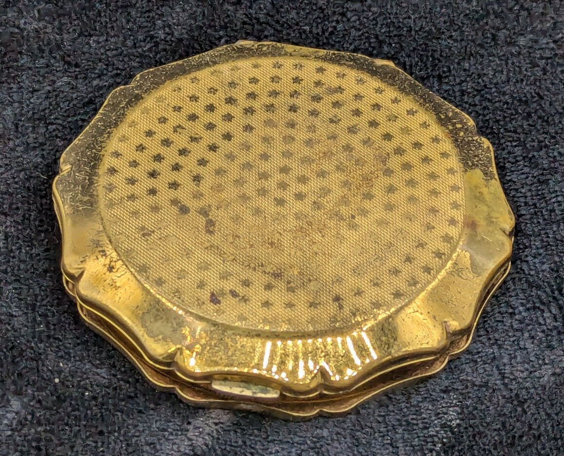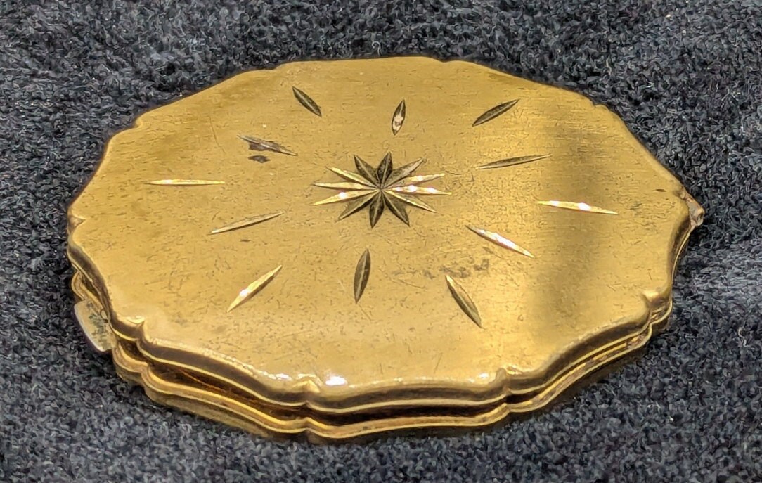 Add a touch of glow with this charming Stratton gold tone powder compact (used/empty). Featuring an art deco design, it's the perfect addition to your glamour collection!